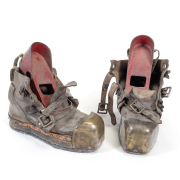 Condition: Metal with patina and surface wear throughout. Helmet with dents and soldering near attachment bases. Scratches to glass panes and cracks to pane to the right of helmet front. Pack is missing latch to secure cover/insert. Boots with significant wear. Suit with some stains and minor wear, no apparent holes or tears. Some separation to glued seams.