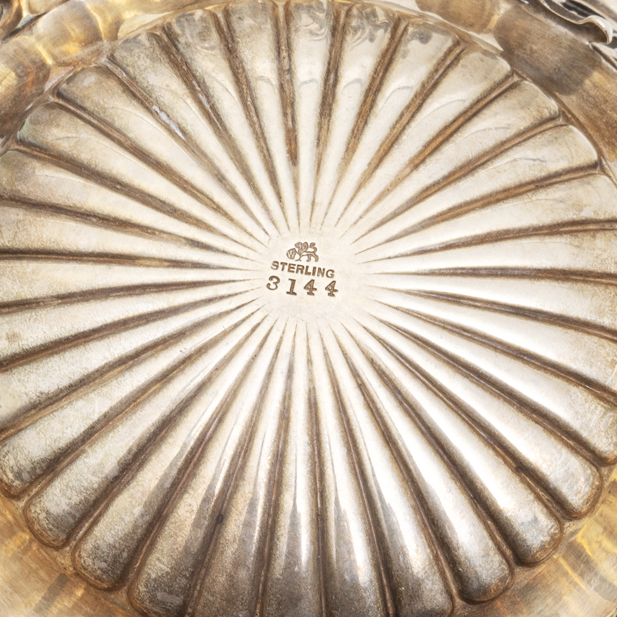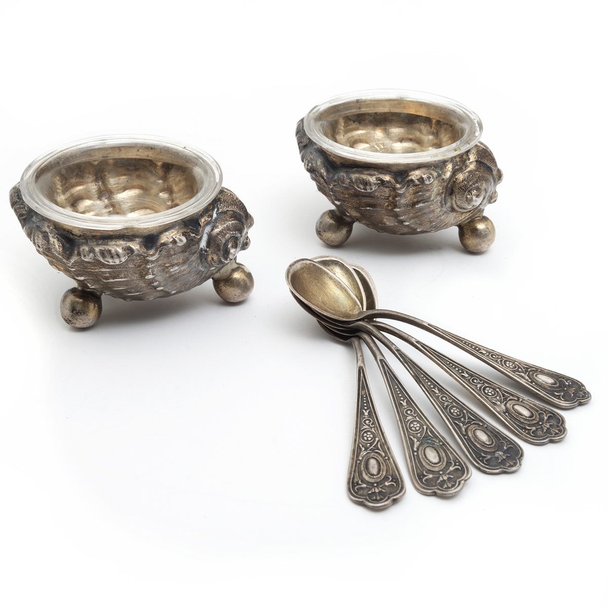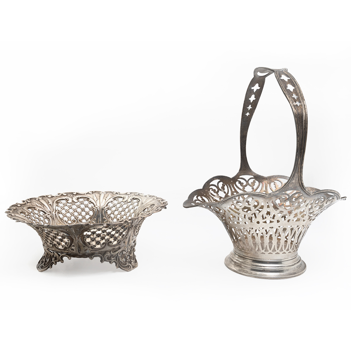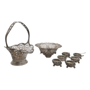 Comprising set of six German .800 silver shell form salt cellars with glass inserts, five married monogrammed spoons, and fitted case from Carl Haymann Gorham pierced basket bowl A5080, Whiting bowl with pierced sides on three feet.