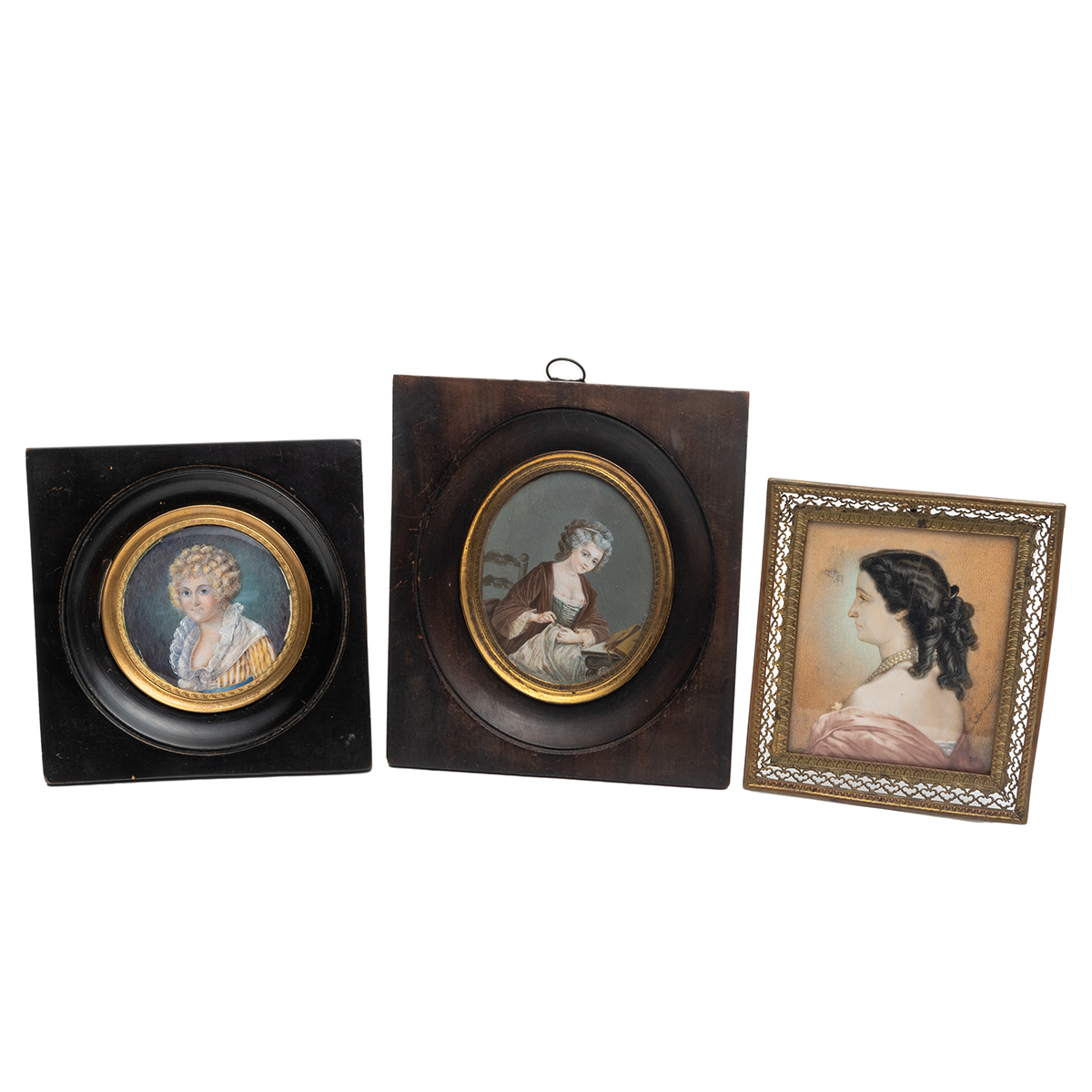Condition: Have not been inspected outside of frames. Some wear to frames throughout. Woman sewing is loose in the frame. Woman with black hair bearing apparent vertical crack from top to middle.