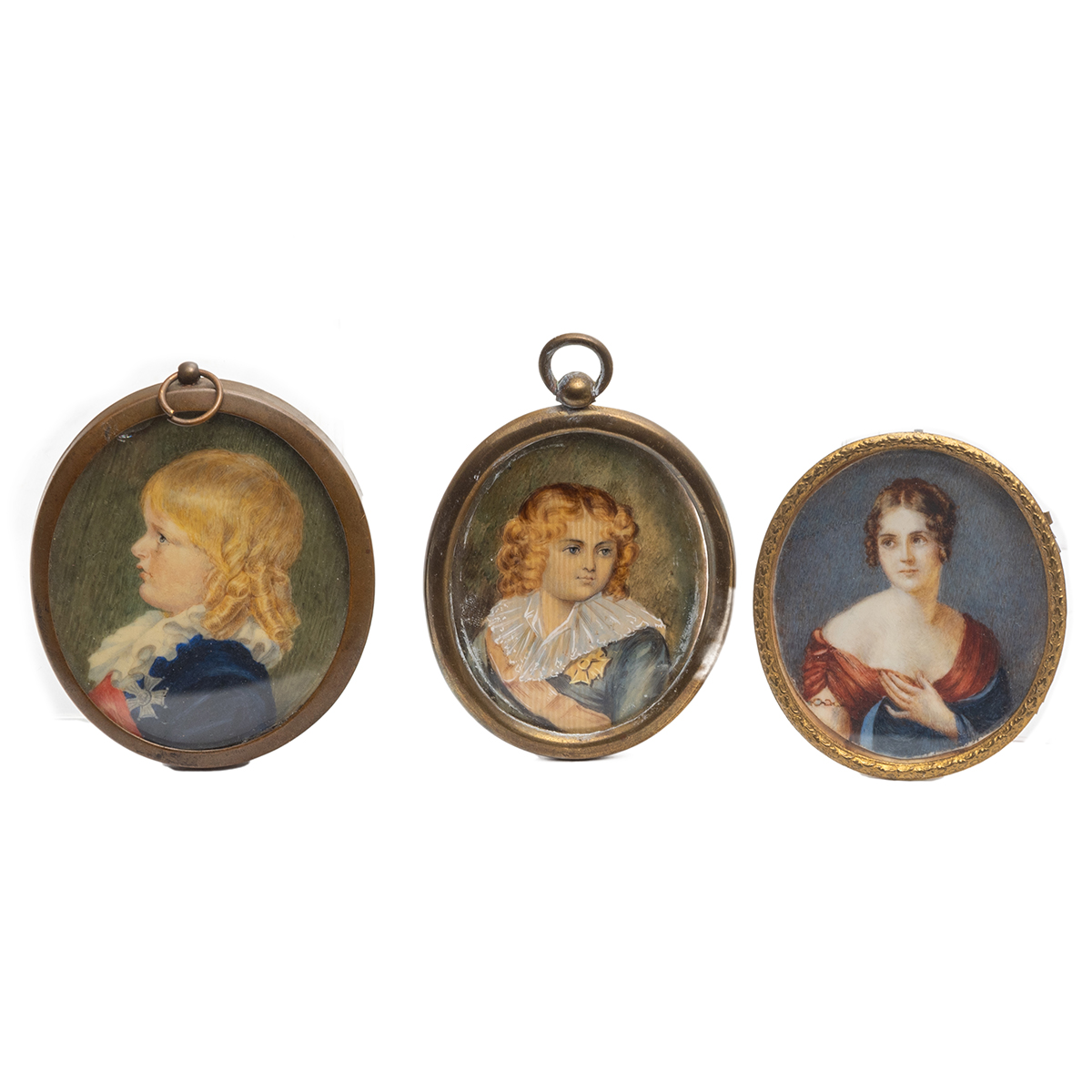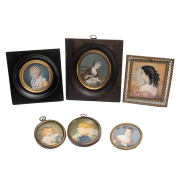 Comprising two of children, three of women portrait of woman with black hair signed indistinctly lower right, possibly Winterhalter, blonde woman also signed indistinctly lower right all framed.