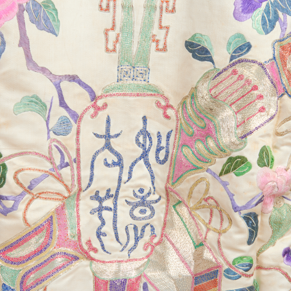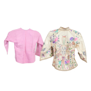 Comprising: a suite of beige ground top and pants, decorated with pink, purple, and turquoise embroideries of ducks, butterflies, flowers, and a vase, the borders finished with elaborate stitches, a purple padded cheongsam dress with black trim and turquoise blue interior, a pink padded cheongsam top with plum and bamboo patterns, and a red partial skirt with sky blue ground borders, the floral patterns on the skirt finished with polychrome beads.