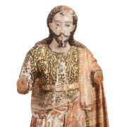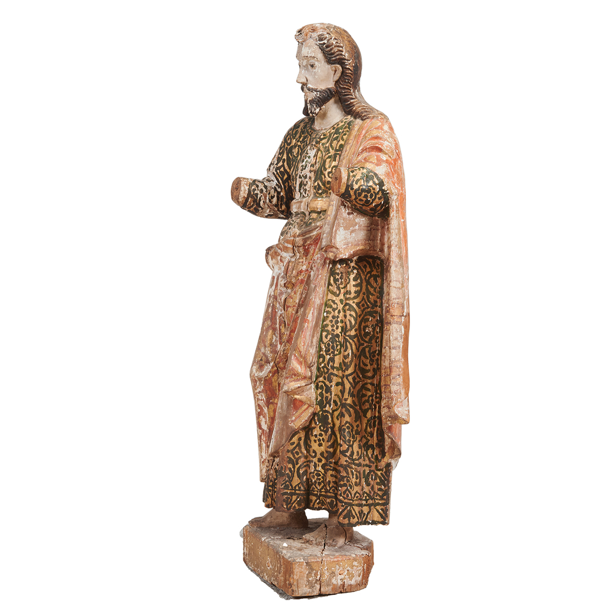 Condition: Patina and wear throughout. Some cracking and paint loss. Loss to wood base with previous insect damage, some repair. Loss to both arms.