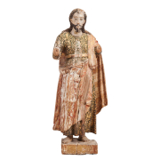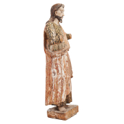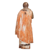 Carved wood painted plaster standing figure in contrapposto pose with arms outstretched painted with parcel gilt trim iron hook with loop to reverse.