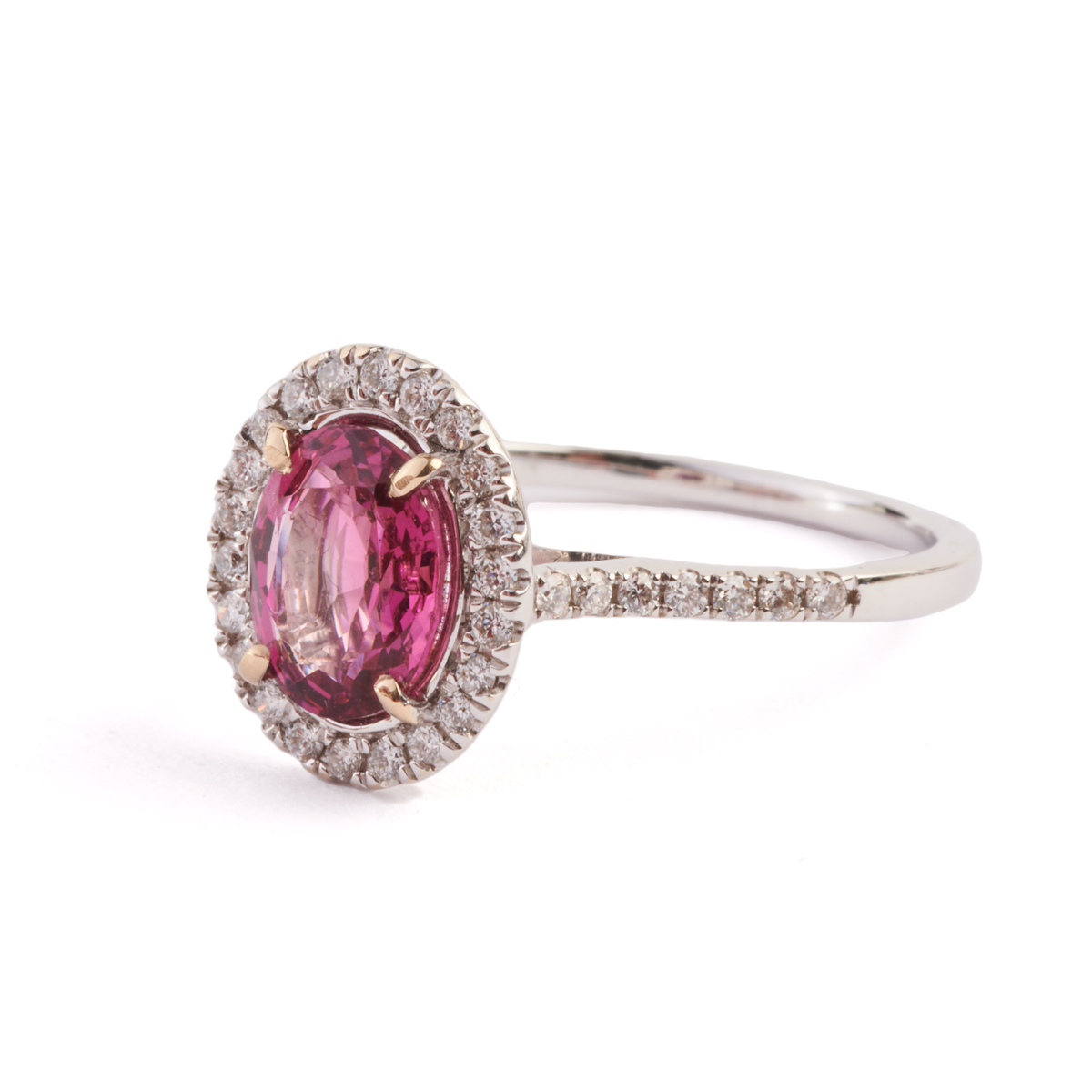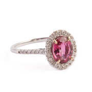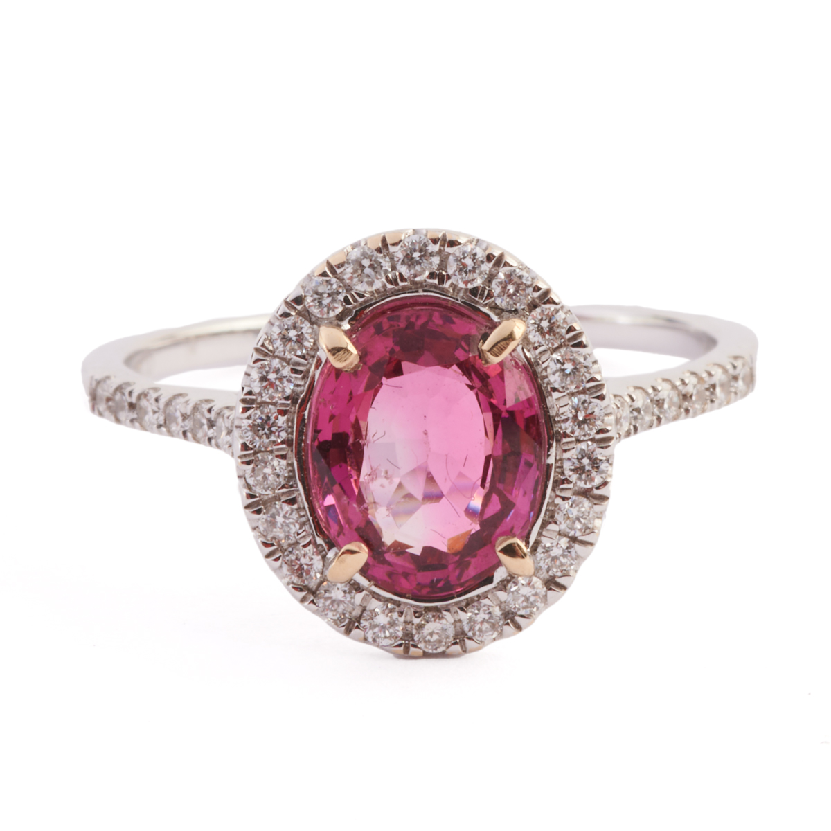 Featuring one oval-cut reddish/pink spinel weighing approximately 1.50 ct., accented by full-cut diamonds weighing a total of approximately 0.25 cttw., set in an 18k white gold mounting.