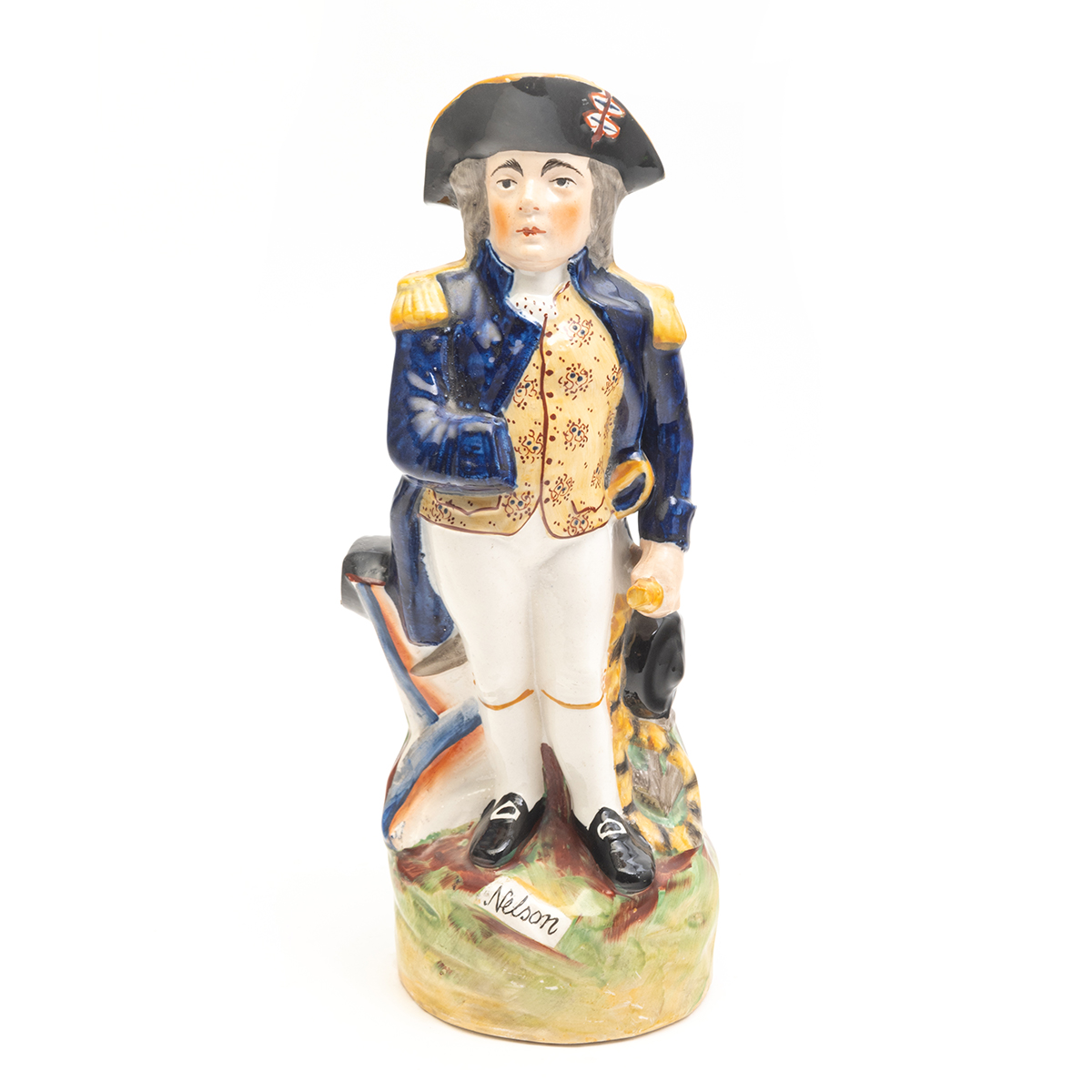 Standing figure in ceremonial military attire, with objects of nautical interest to his side, small script by his feet reads Nelson.