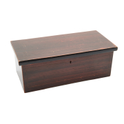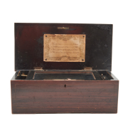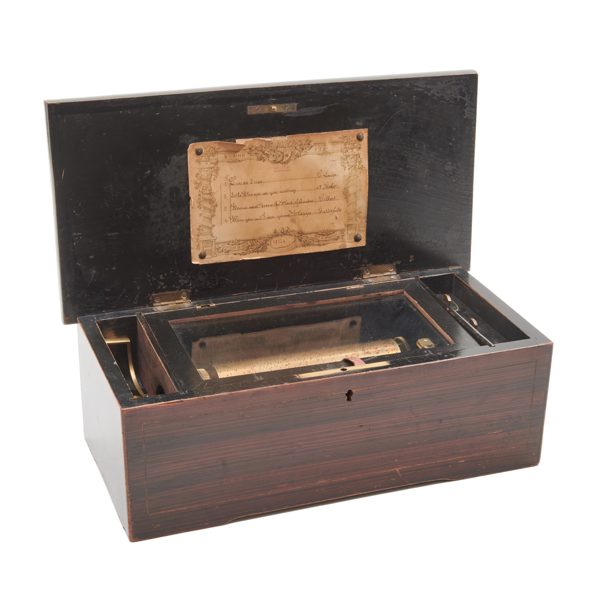 6 cylinder, playing four airs, grained wood case with parcel ebonized trim, with paper label in French to cover interior.