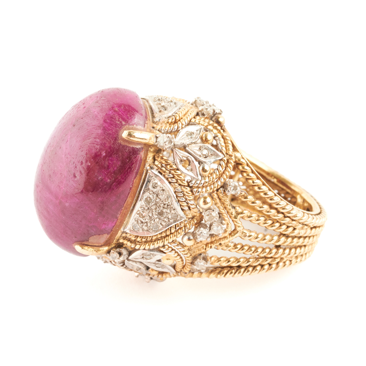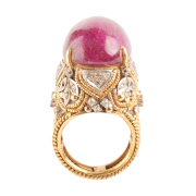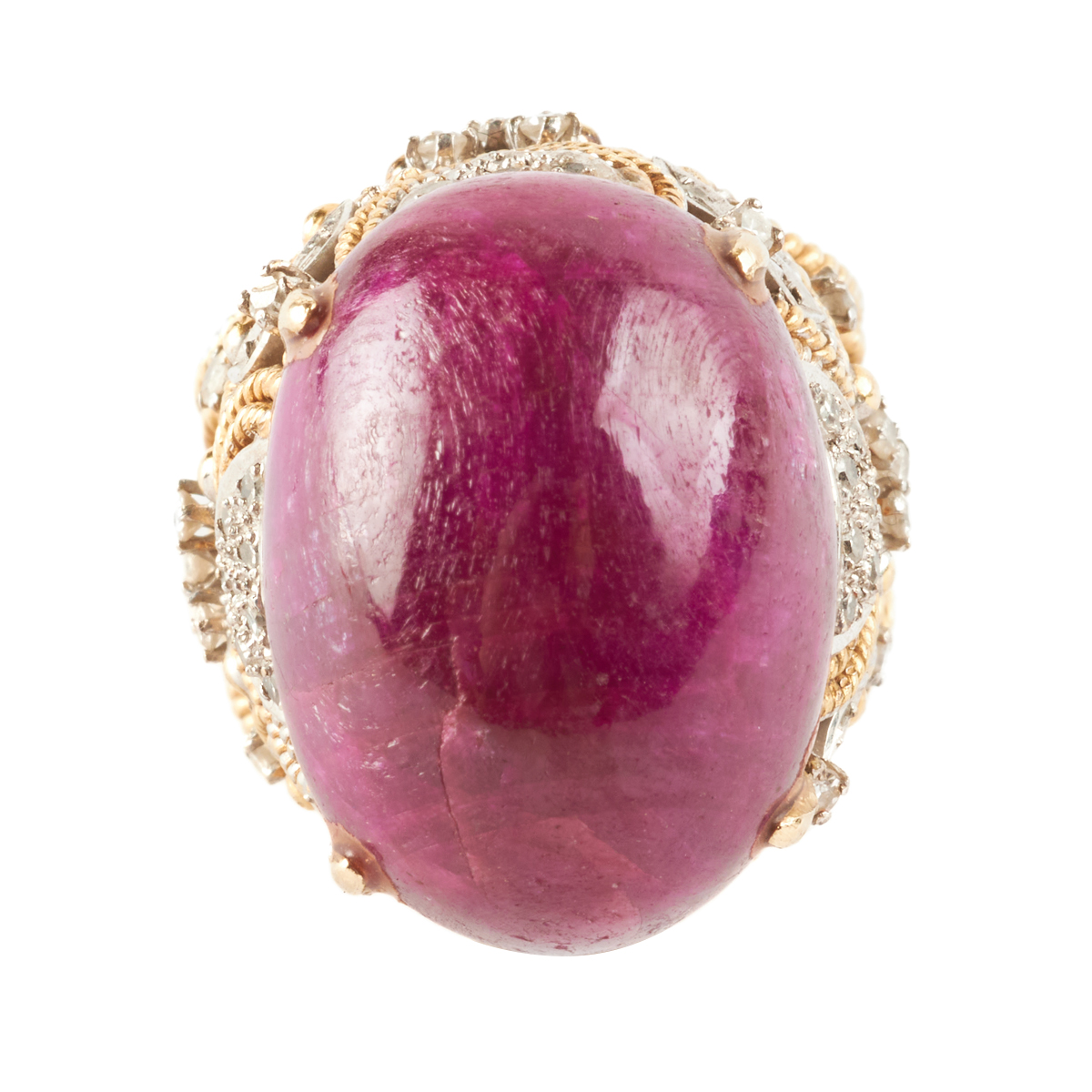 Featuring one oval shaped synthetic ruby cabochon measuring approximately 22.1 x 16.4 mm, accented by fifty-four single-cut diamonds weighing a total of approximately 0.25 cttw., set in a 14k yellow and white gold mounting measuring approximately 25 mm in width.