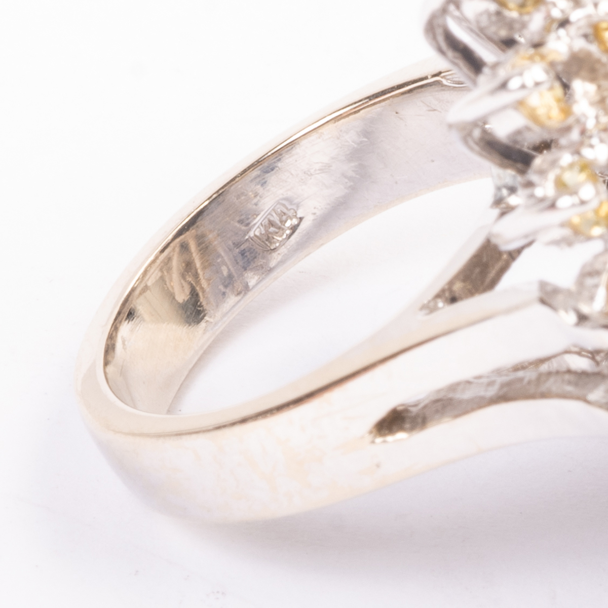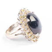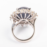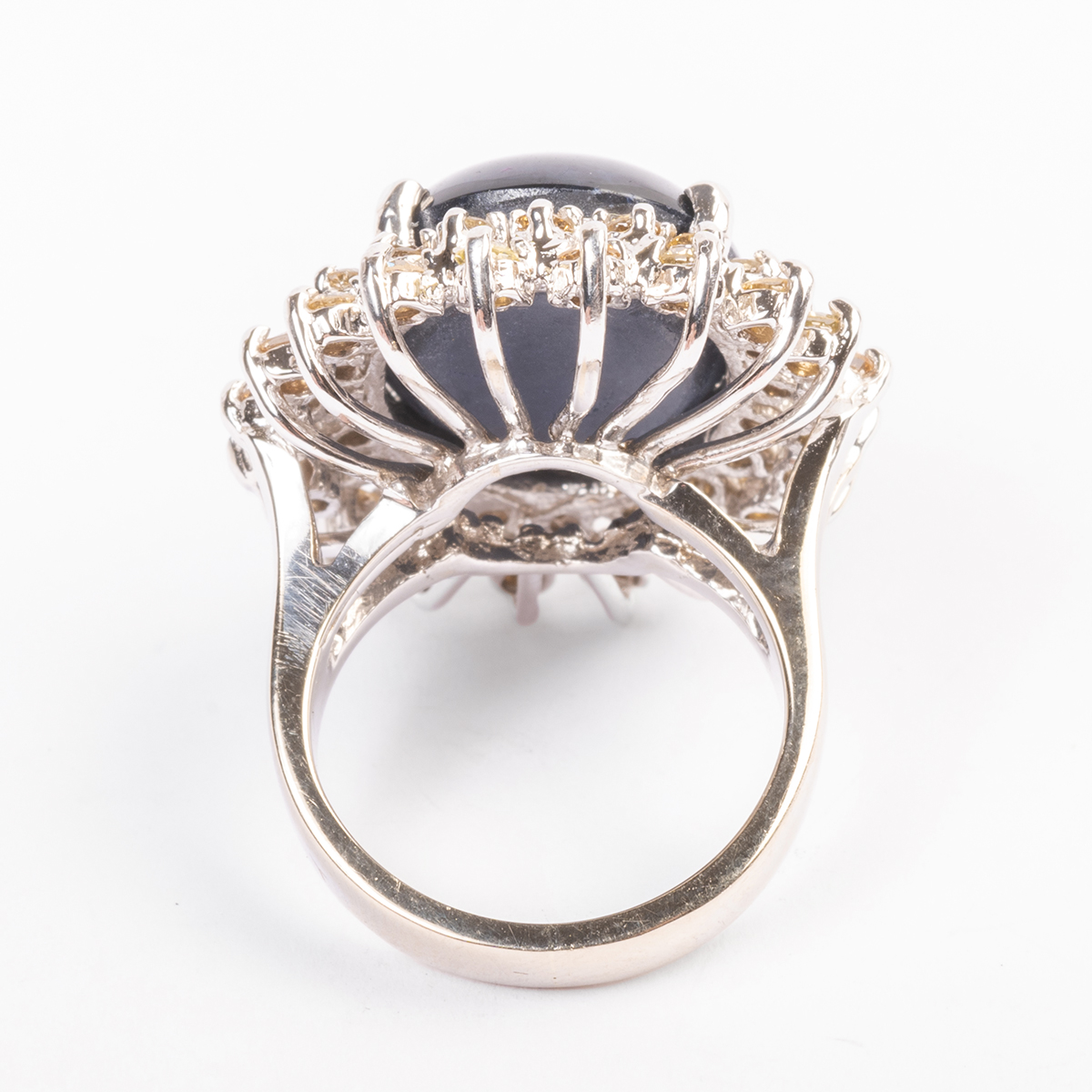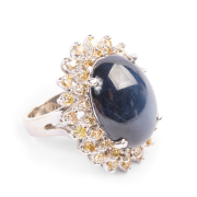 Featuring one oval shaped synthetic star sapphire cabochon measuring approximately 19.05 x 14.6 mm, surrounded by round-cut irradiated yellow diamonds, set in a 14k white gold mounting.