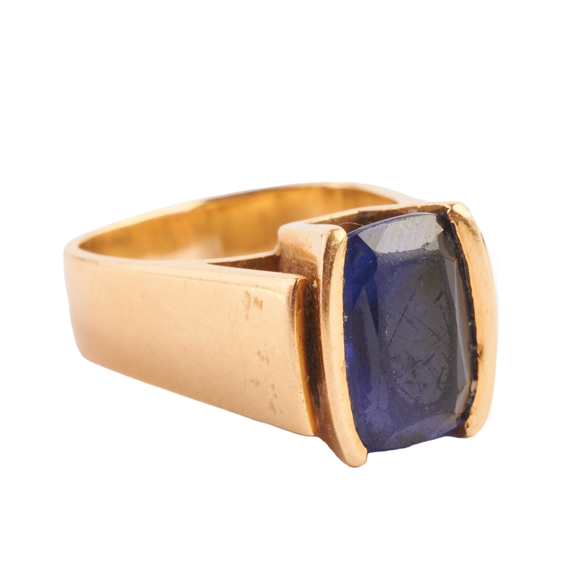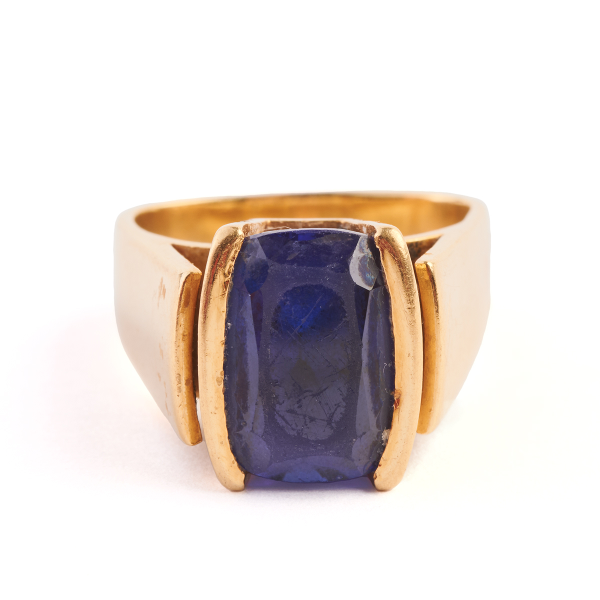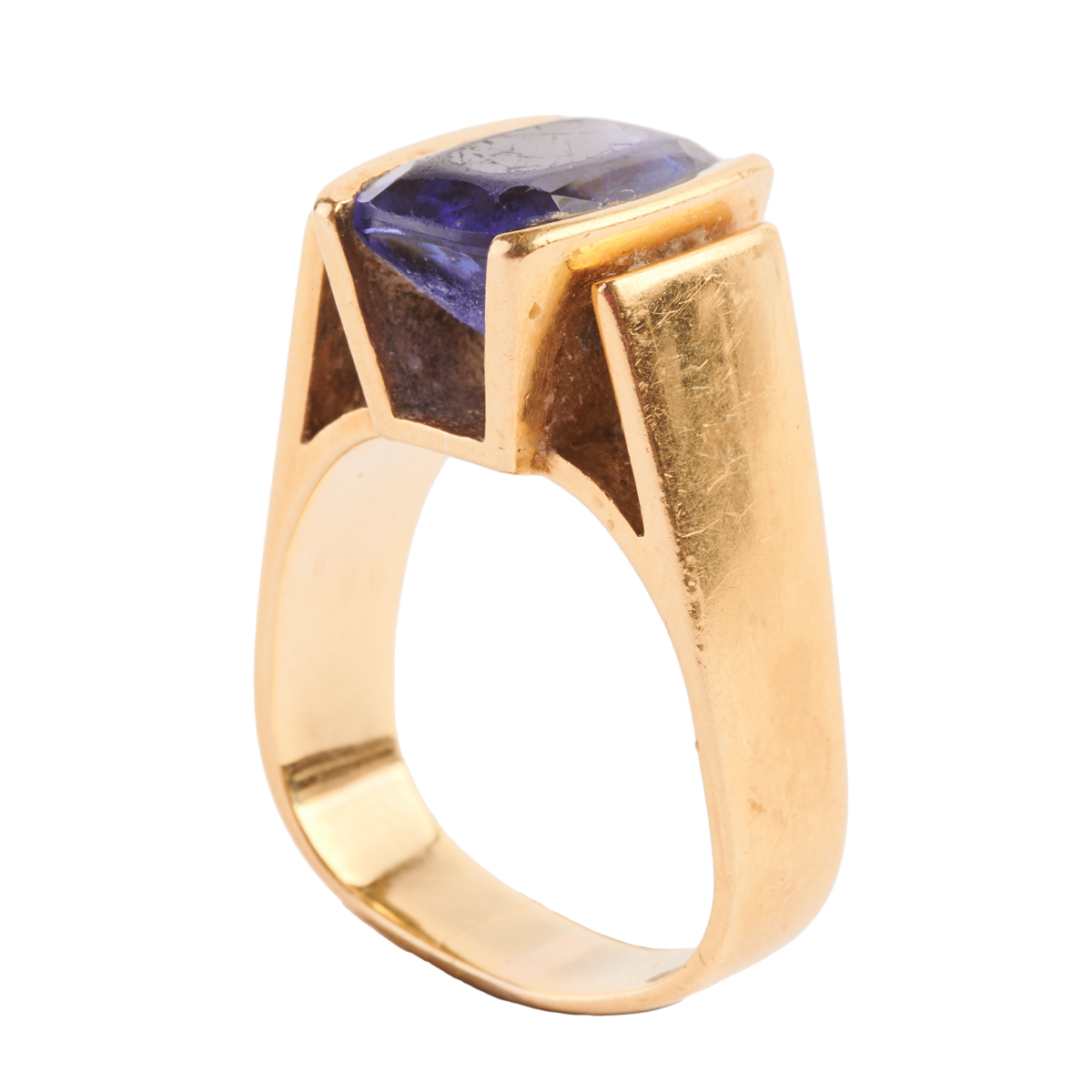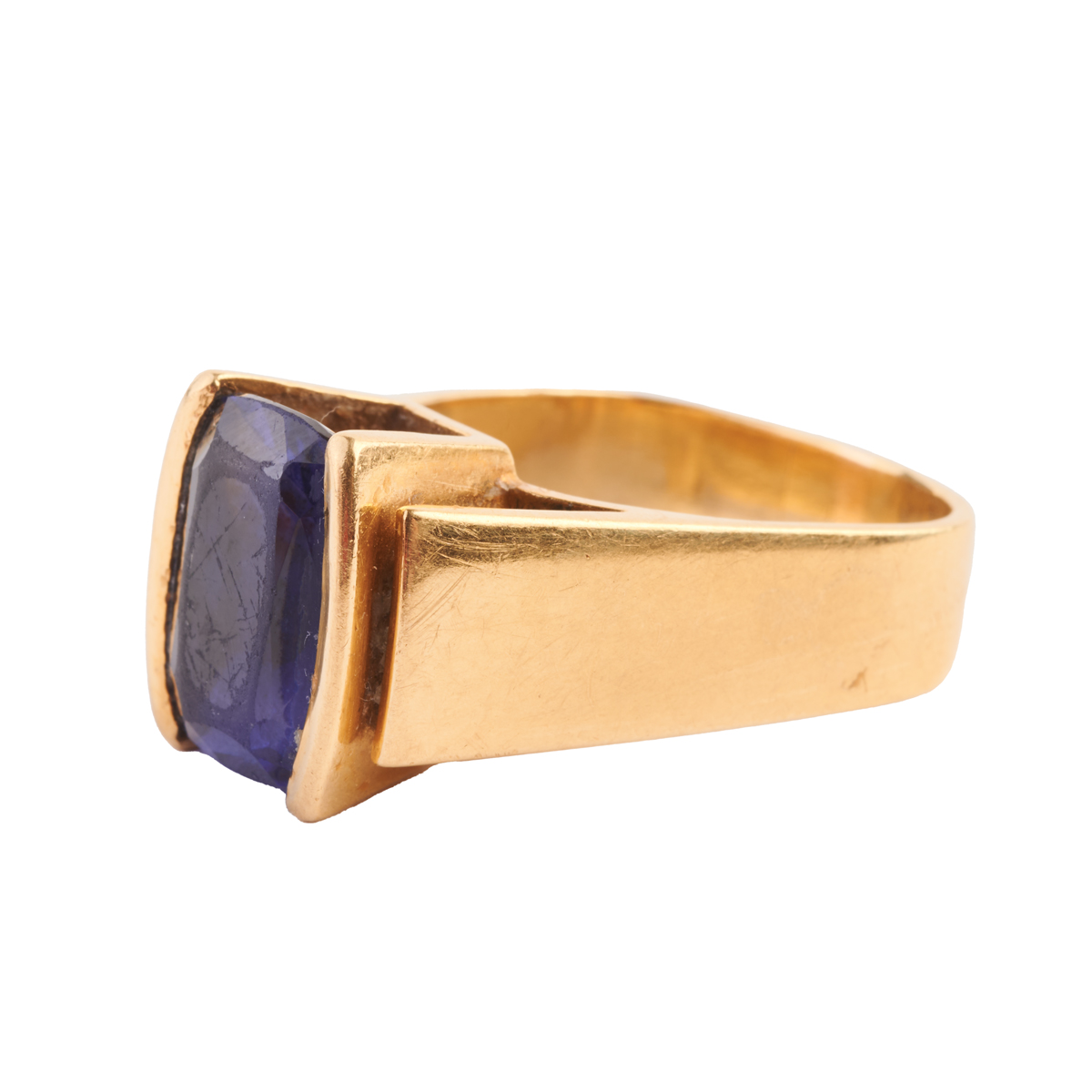 Featuring one cushion-cut tanzanite weighing approximately 4.70 cts., set in an 18k yellow gold squared shank mounting.