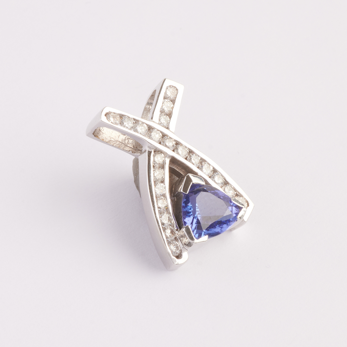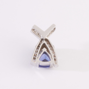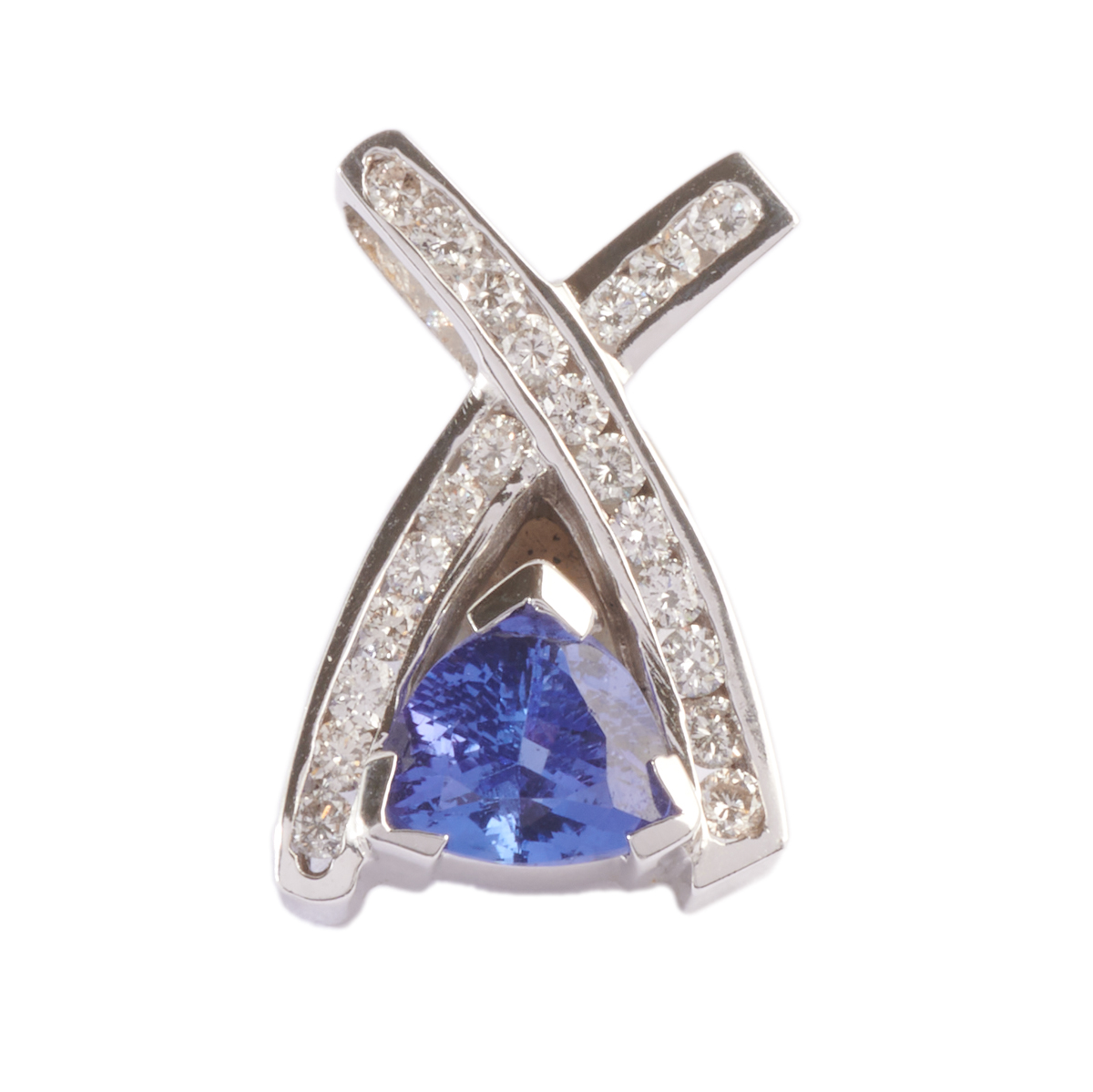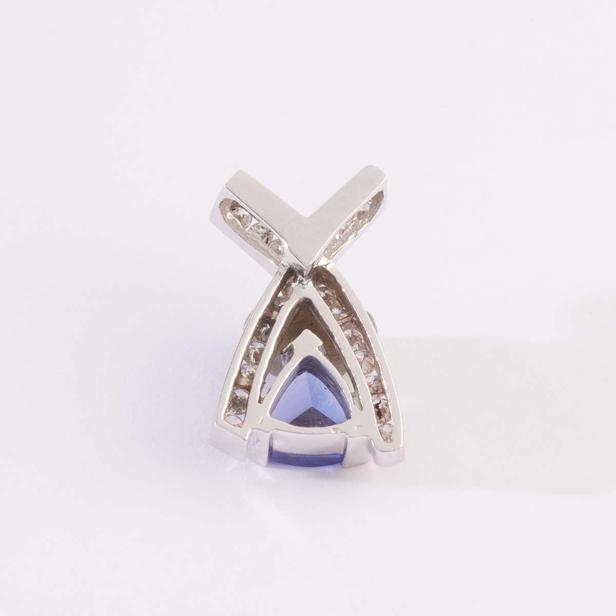 Featuring one triangular-cut tanzanite weighing approximately 2.00 cts., accented by twenty-one full-cut diamonds weighing a total of approximately 0.65 cttw., set in a 14k white gold mounting measuring approximately 23 x 15 mm.