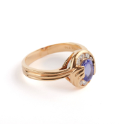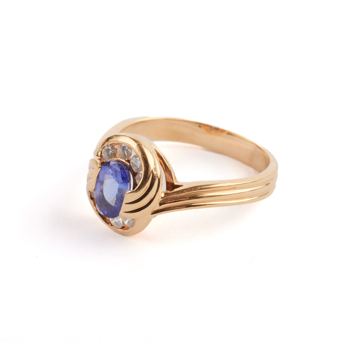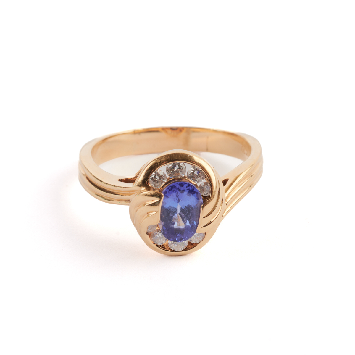 Featuring one oval-cut tanzanite weighing approximately 1.45 ct., accented by eight full-cut diamonds weighing a total of approximately 0.40 cttw., set in an 18k yellow gold mounting.