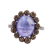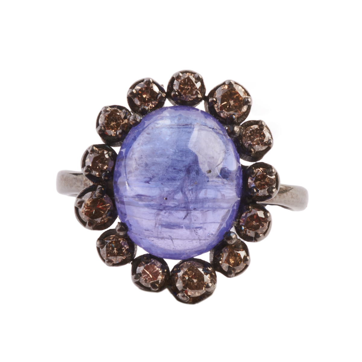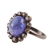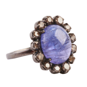 Featuring one oval shaped tanzanite cabochon measuring approximately 11.6 x 9.4 mm, surrounded by thirteen full-cut diamonds weighing a total of approximately 0.65 cttw., set in an oxidized silver mounting.