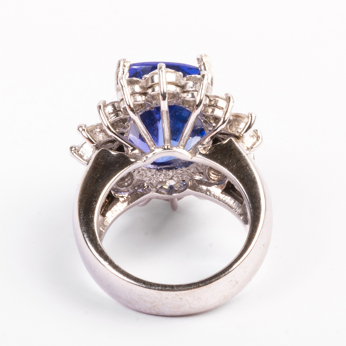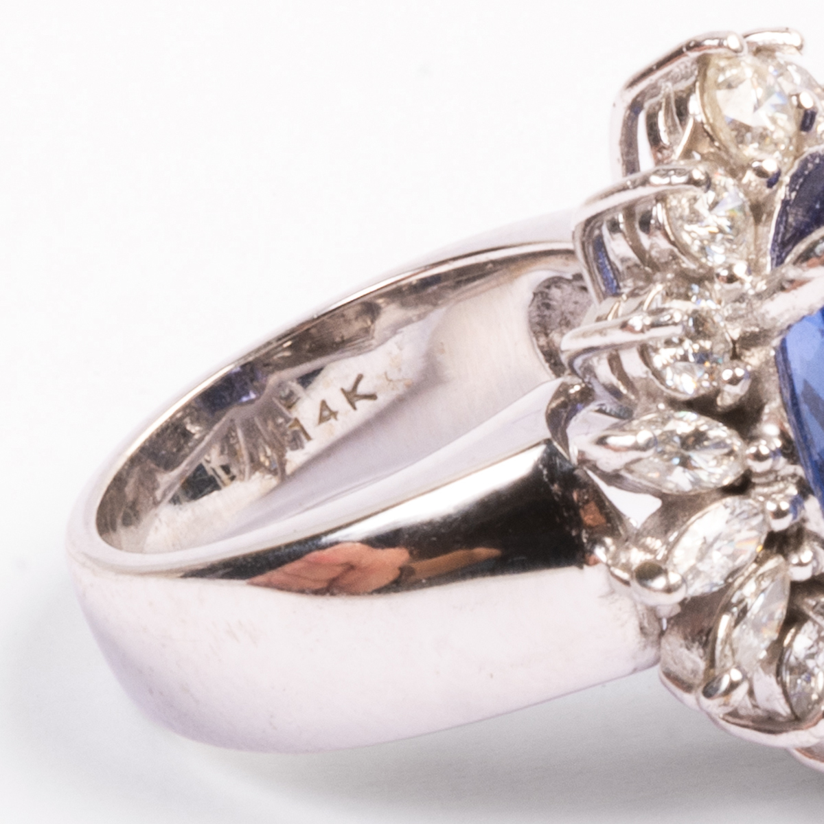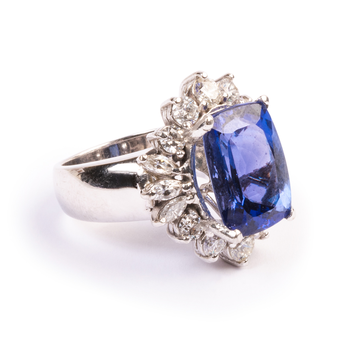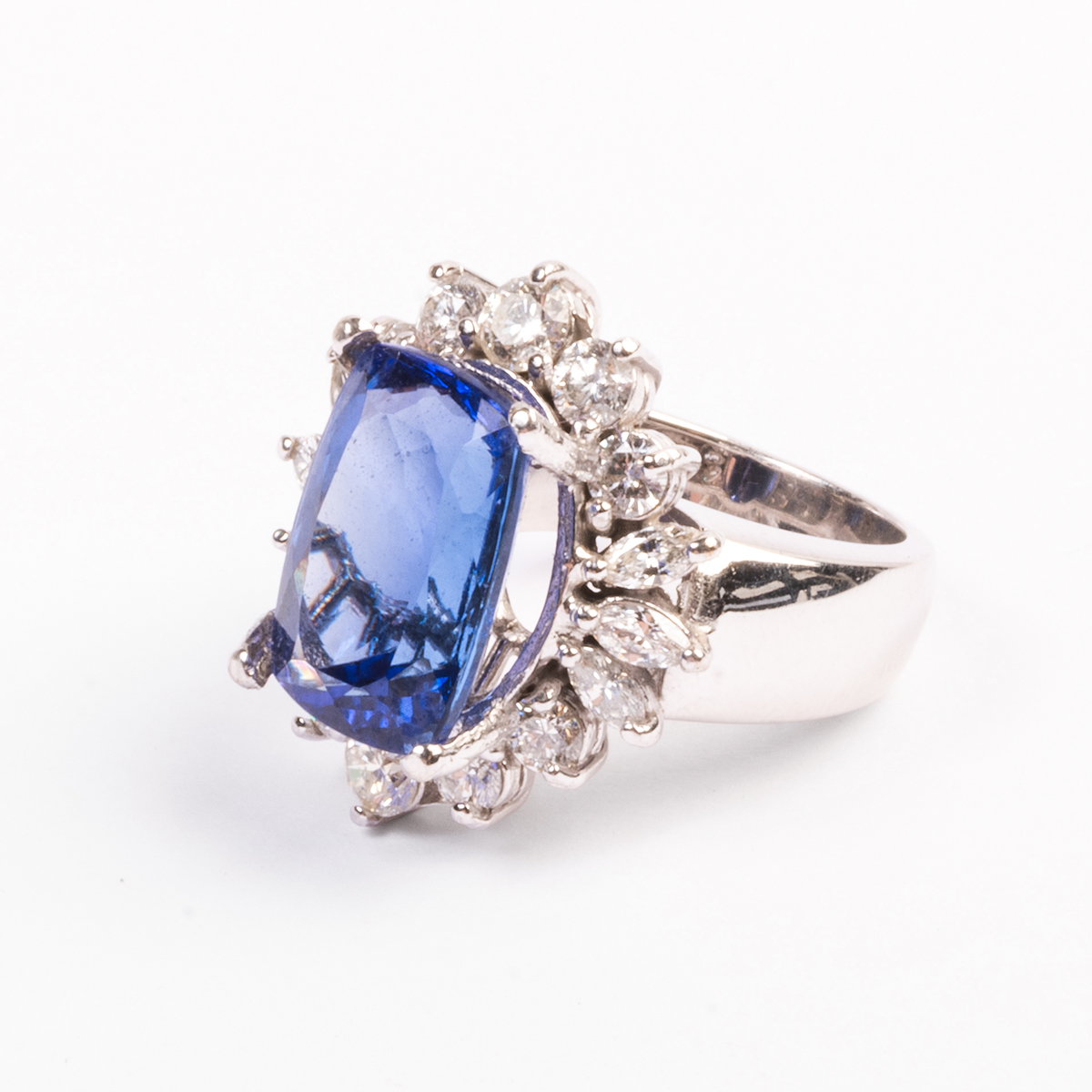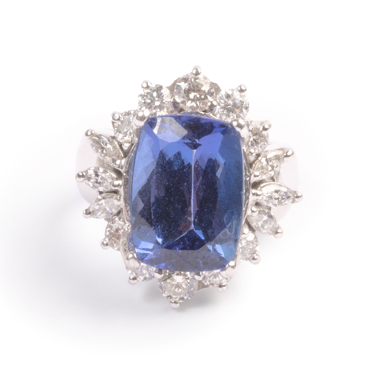Featuring one cushion-cut tanzanite weighing approximately 8.25 cts., accented by marquise-cut and full-cut diamonds weighing a total of approximately 1.85 cttw., set in a 14k white gold mounting.