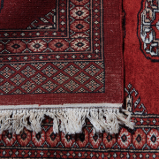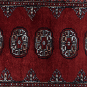 Line of round medallions on red ground woven in red, beige, white, and black.