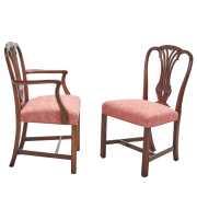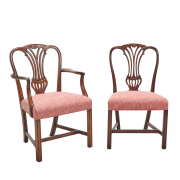 Comprising two armchairs and eight side chairs, pink and red upholstered seats.