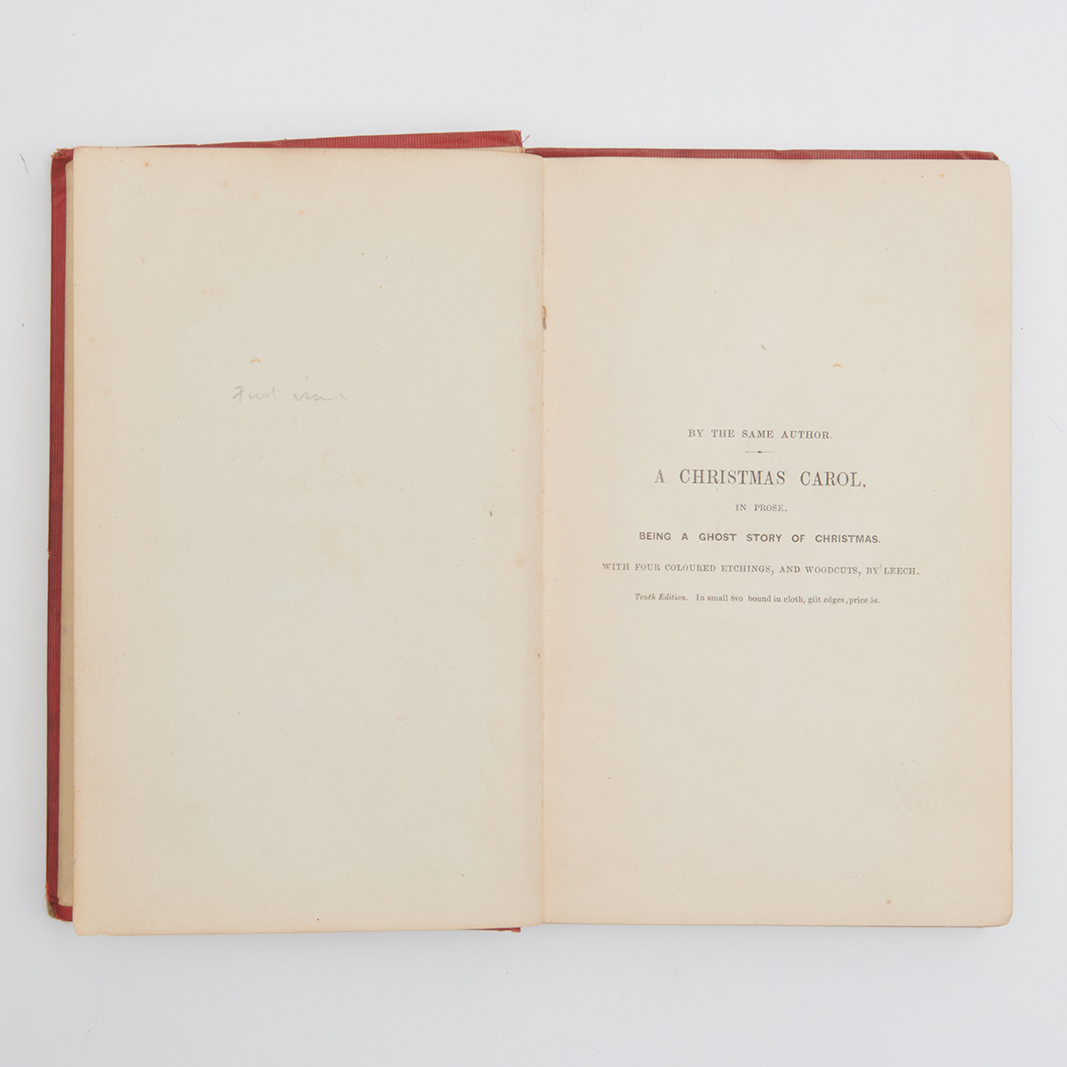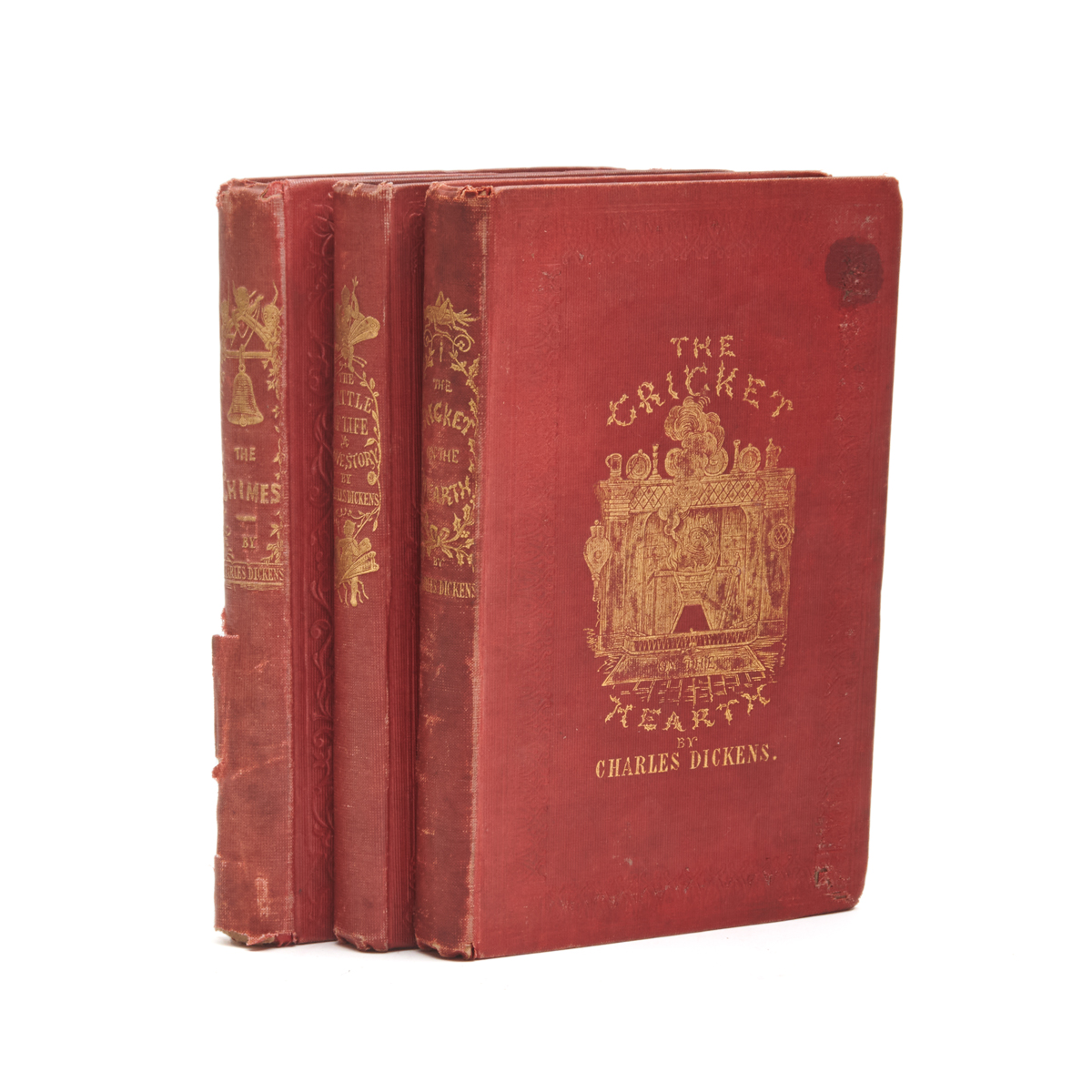 Comprising The Cricket on the Hearth first issue, London, Bradbury Evans, 1846 The Battle of Life: A Love Story, London, Bradbury Evans, 1846 The Chimes: A Goblin Story, London, Chapman and Hall, 1845 all with gilt embossed red hardcovers, pages with gilt edges.
