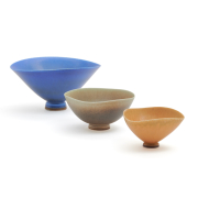 Approximate dimensions: Blue bowl 3 1/2 high x 6 3/4 diameter, green bowl 2 1/2 high x 4 3/4 diameter, brown bowl 2 1/4 high x 3 5/8 diameter..
