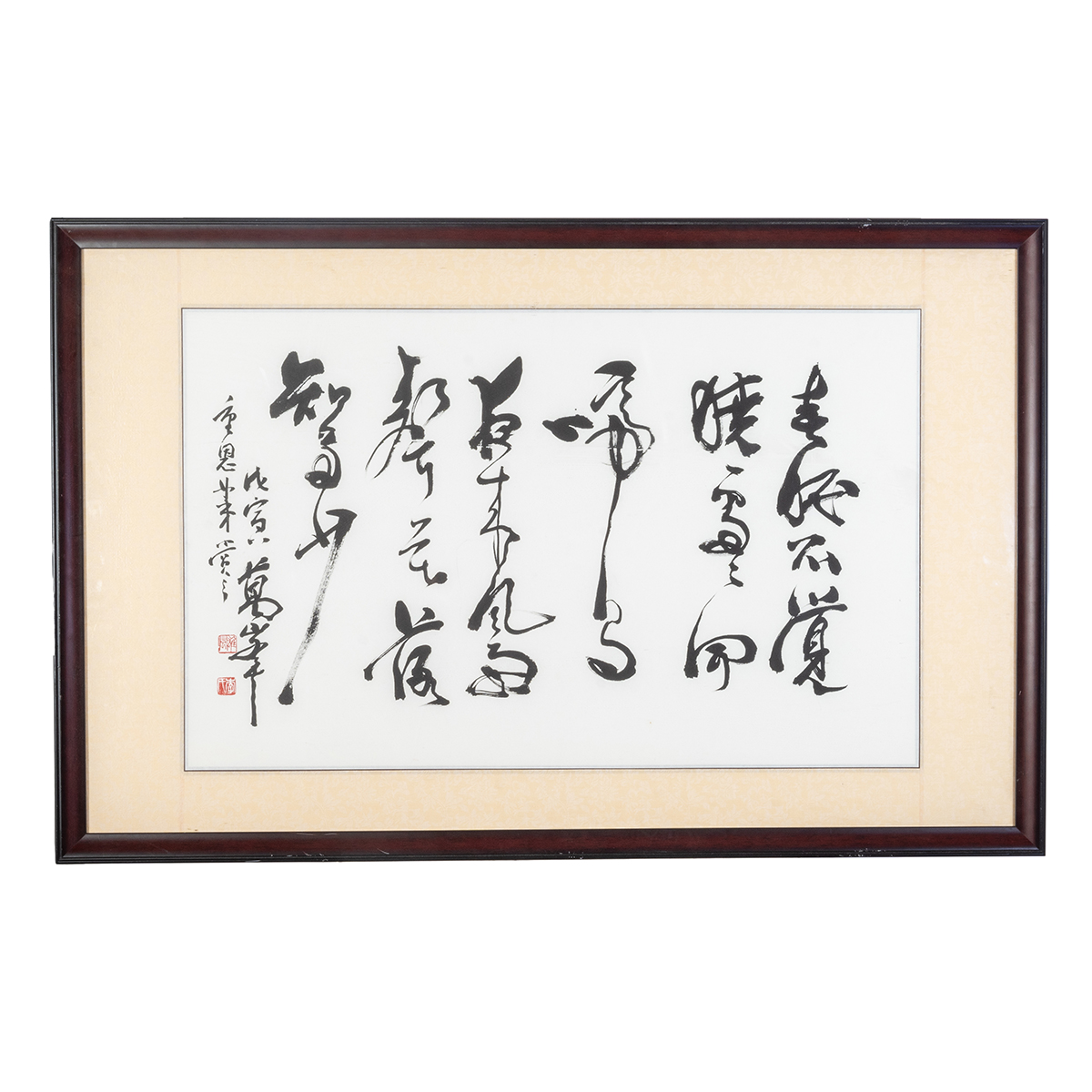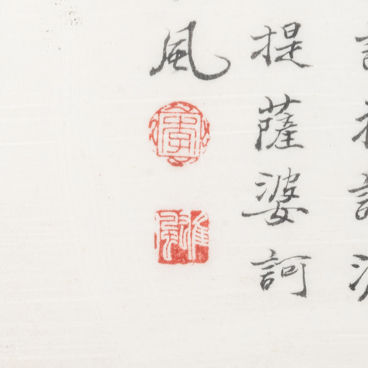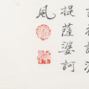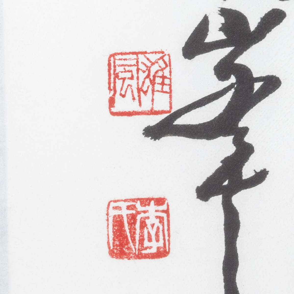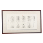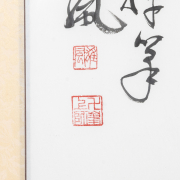 Comprising: One horizontal Heart Sutra in Buddhism, the shortest of the Buddhist scriptures in clerical script, translated as The Heart of the Perfection of Wisdom, signed and stamped One vertical At Hibiscus Inn Parting With Xin Jian from Tang dynasty poet Wang Changling in semi-cursive font, signed and stamped One horizontal A Spring Dawn by Tang dynasty poet Meng Haoran in semi-cursive font, signed and stamped.