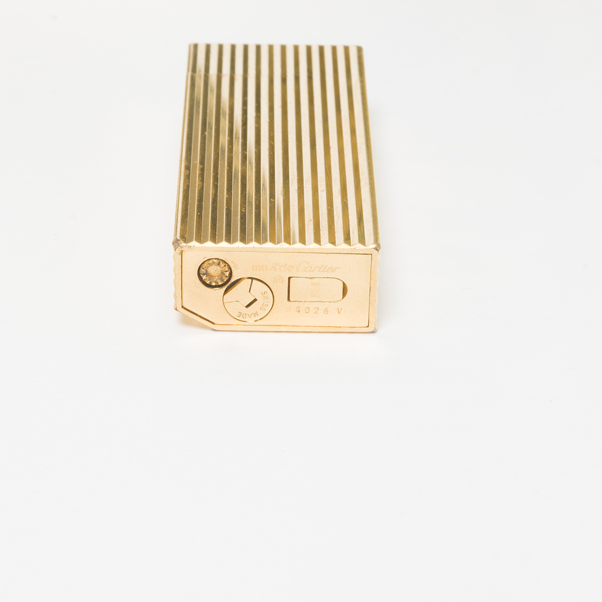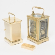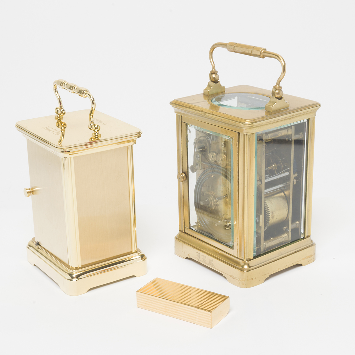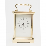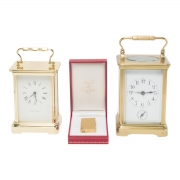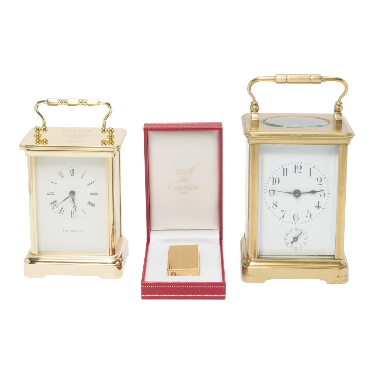 Comprising the Cartier gilt metal lighter in box, Tiffany Co carriage clock inscribed with REVLON 15 YEARS battery driven movement, and brass carriage clock with monogram to reverse.