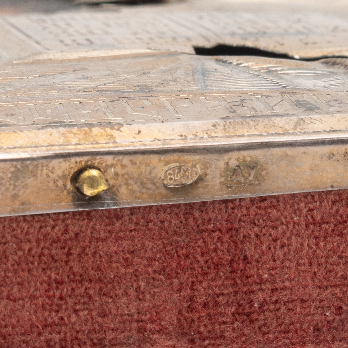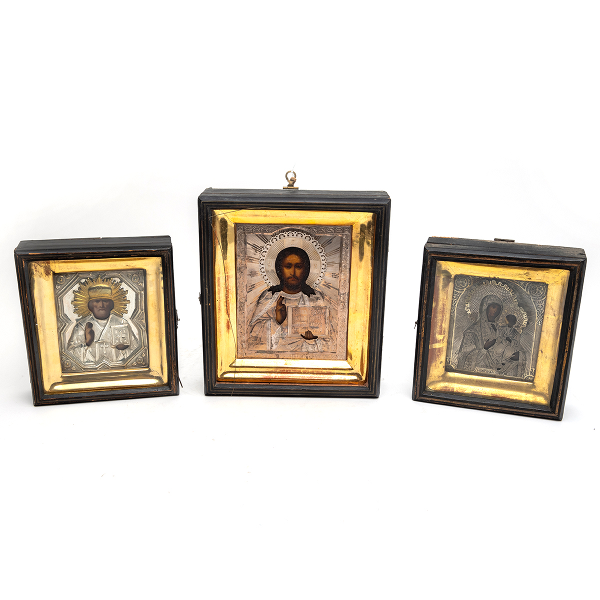 Comprising painted wood icon of Christ Pantocrater, the oklad with Russian silver hallmarks painted wood icon of the Virgin Mother holding the Christ Child, gilt wash oklad with Russian silver hallmarks painted wood icon of man, likely St. Peter, silver-metal oklad lacking hallmarks all in shadowbox frames.