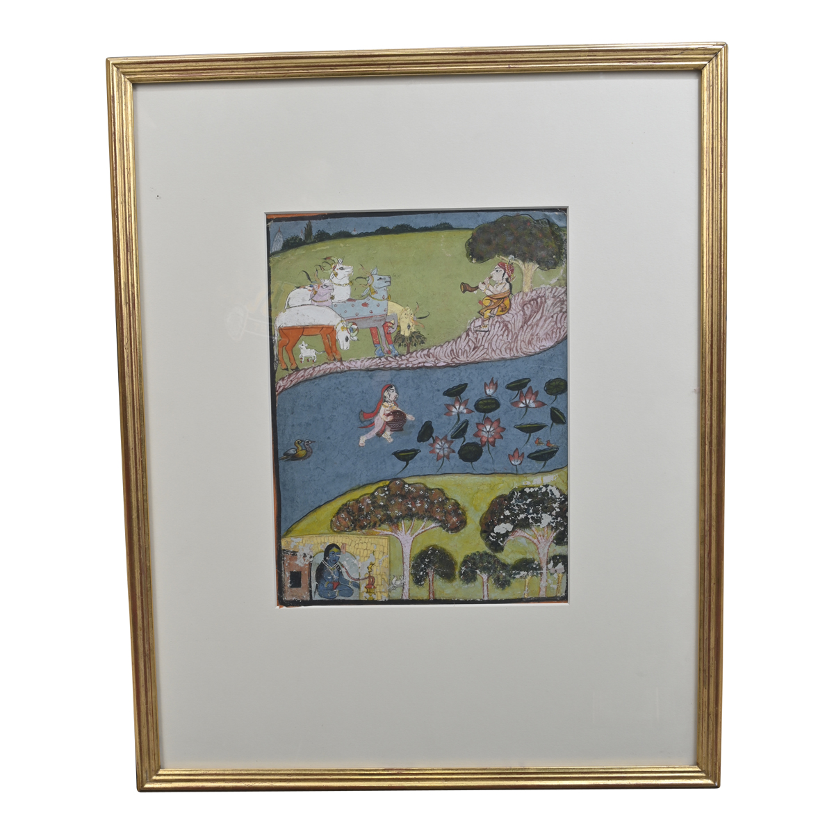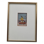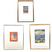 Comprising a scene with Ganesha seated on a throne with his rat, and a female figure standing beside him scene with yellow deity on some kind of stage with a female figure on either side and a river landscape scene, with various figures, animals, and foliage.