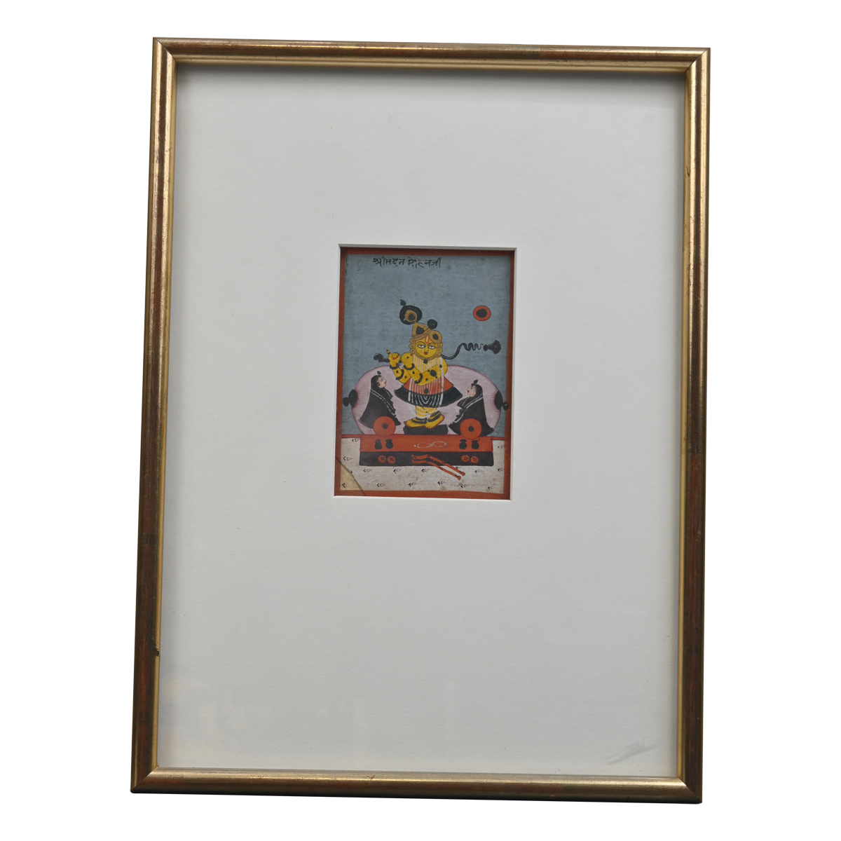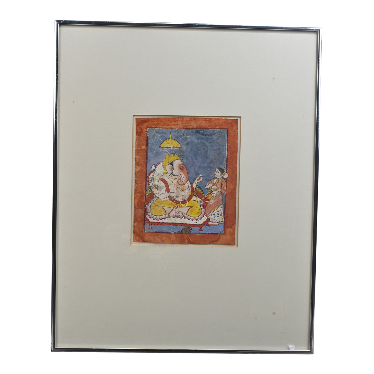 Condition: Ganesha scene with some loss to the surface, with overpainting. Looks to be loss to plaster over the paper. Similar damage to two corners of the yellow deity painting. The landscape scene with minor paint loss and wear.