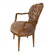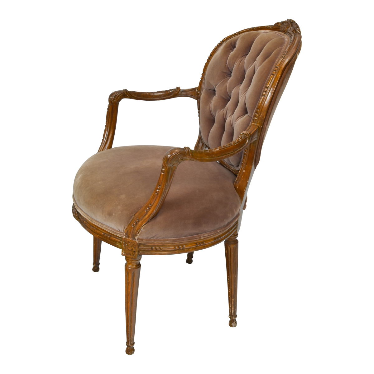 With faded tufted purple upholstery. With white upholstery, carved acanthus accents to the crown rail, scroll carved arms, fluted round taper legs.