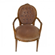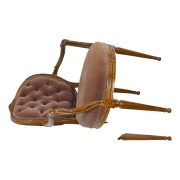 Condition: Restoration and repair throughout. One chair with broken leg that needs to be repaired. Surface wear throughout. Fading to the upholstery.Condition: Moderate condition. Repairs and restoration, most noticeably to the arms, one of which needs to be restored again. Staining to upholstery. Some wear throughout.