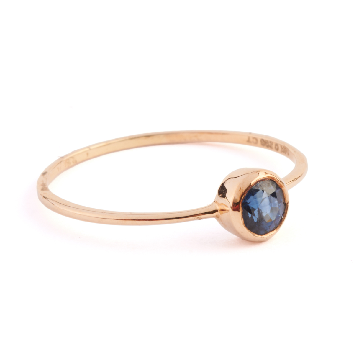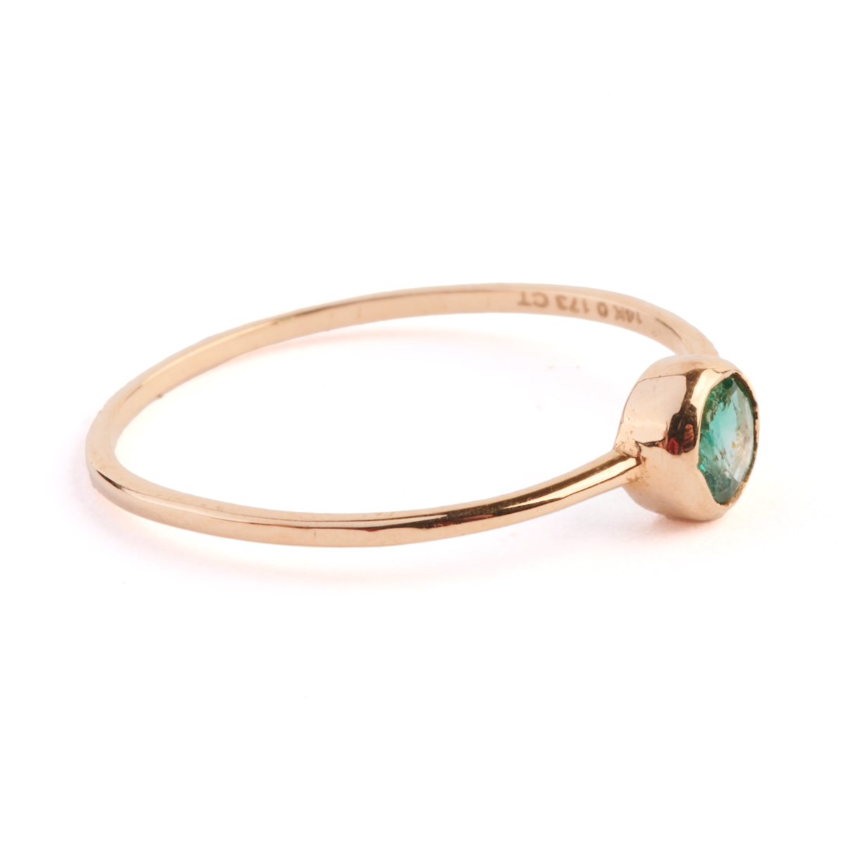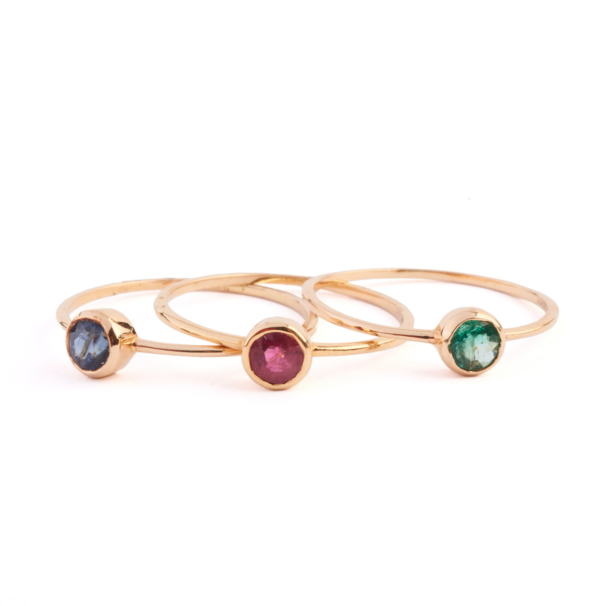 Including one bezel set round-cut ruby, 14k yellow gold ring, size 6 one matching round-cut sapphire ring, size 6 together with a matching round-cut emerald ring, size 6.