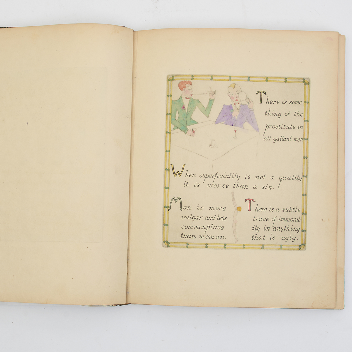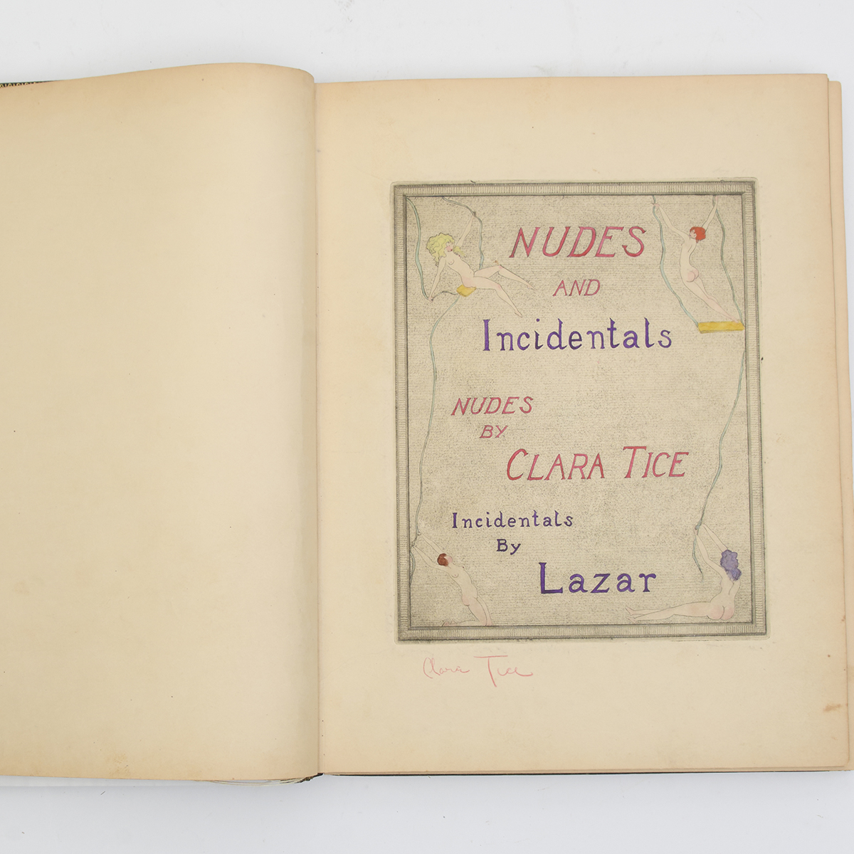 Nudes and Incidentals with off white satin grosgrain to boards, signature, Clara Tice in red, with engravings hand aquatinted by Tice. 28 illustrations. Then, poetic text in black, brown, green, red and blue,