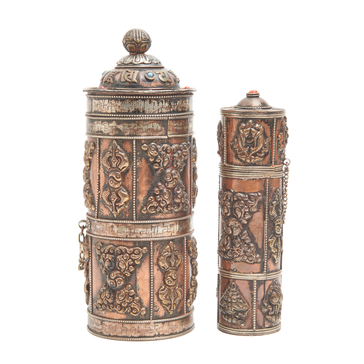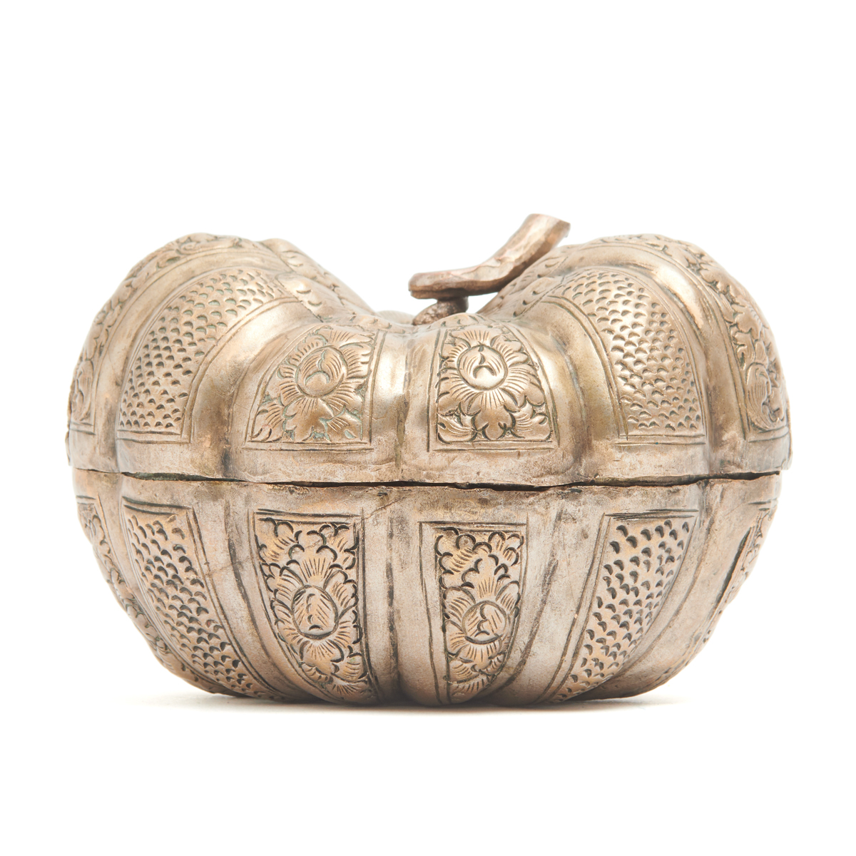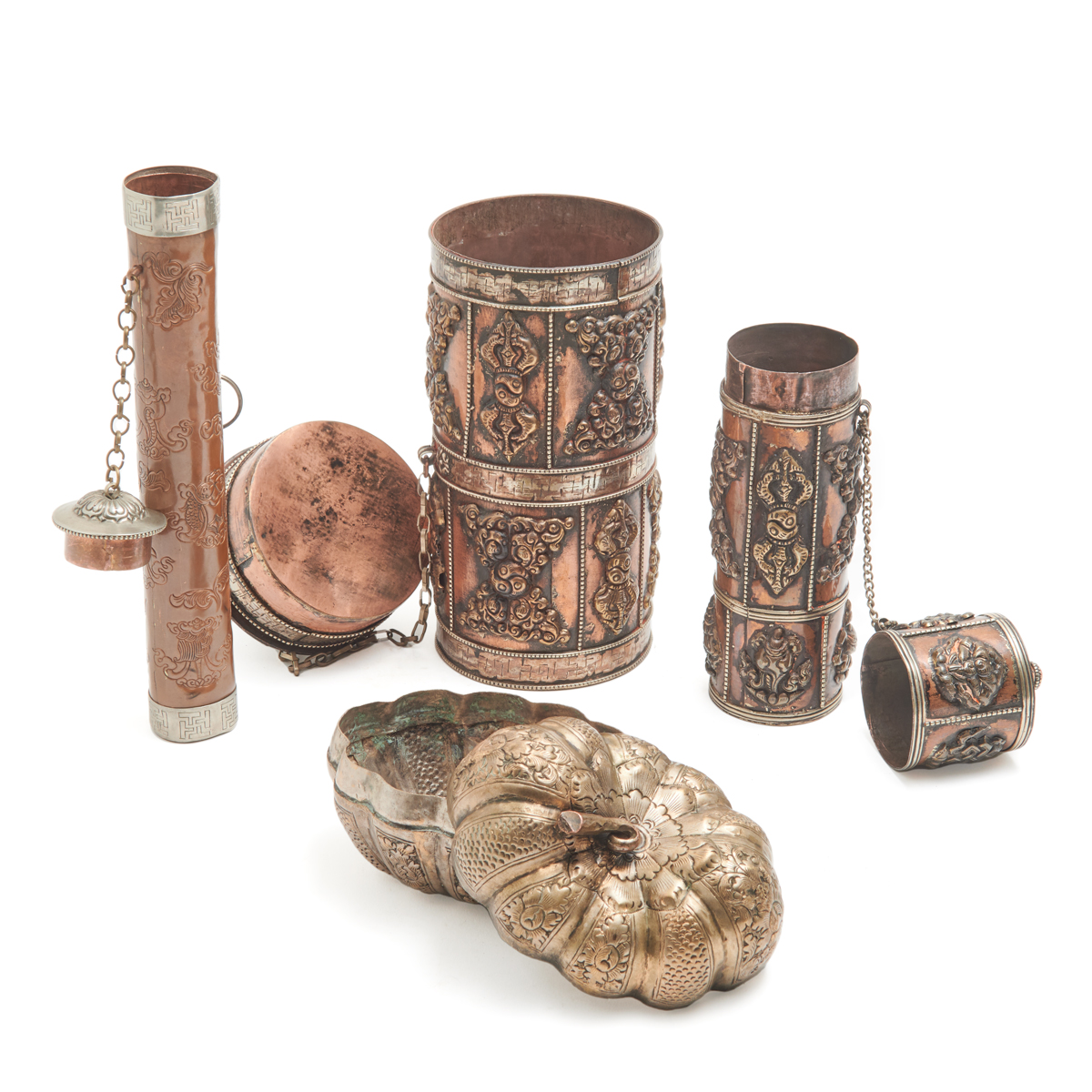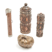 Comprising: a cylindrical incense holder with incised carvings of auspicious symbols on a brown-glazed body and two bands of immortal symbols on the white metal rims a cylindrical incense holder with two bands of embossed decorations and a cylindrical cover attached by a chain with a red bead embedded at the top a wide cylindrical incense holder with two identical bands of embossed symbols on the body, the domed cover adorned with turquoise and red-colored beads and attached to the body by a chain a Cambodian pumpkin-form box adorned with foliage carvings, its handle in the form of a pumpkin stem.