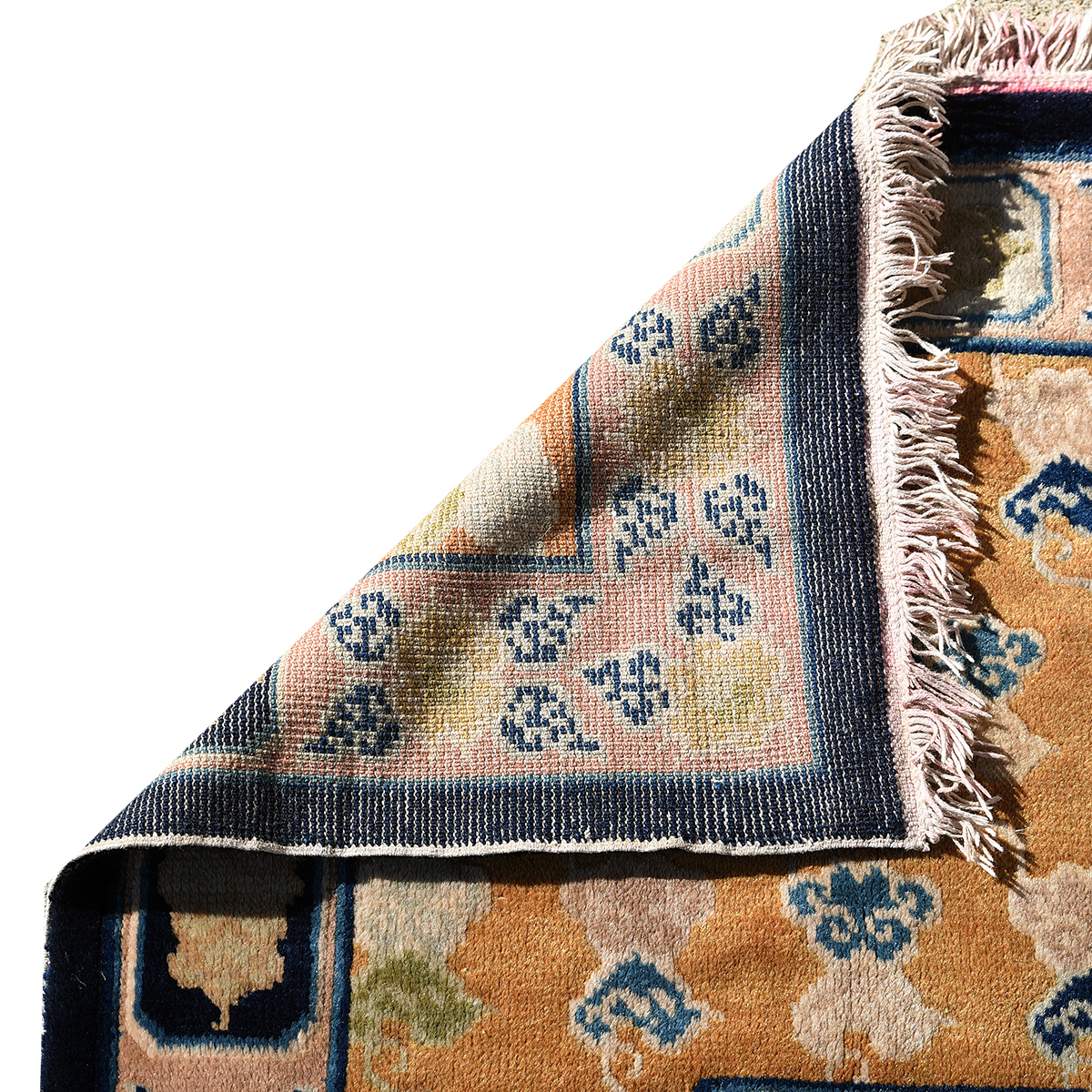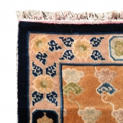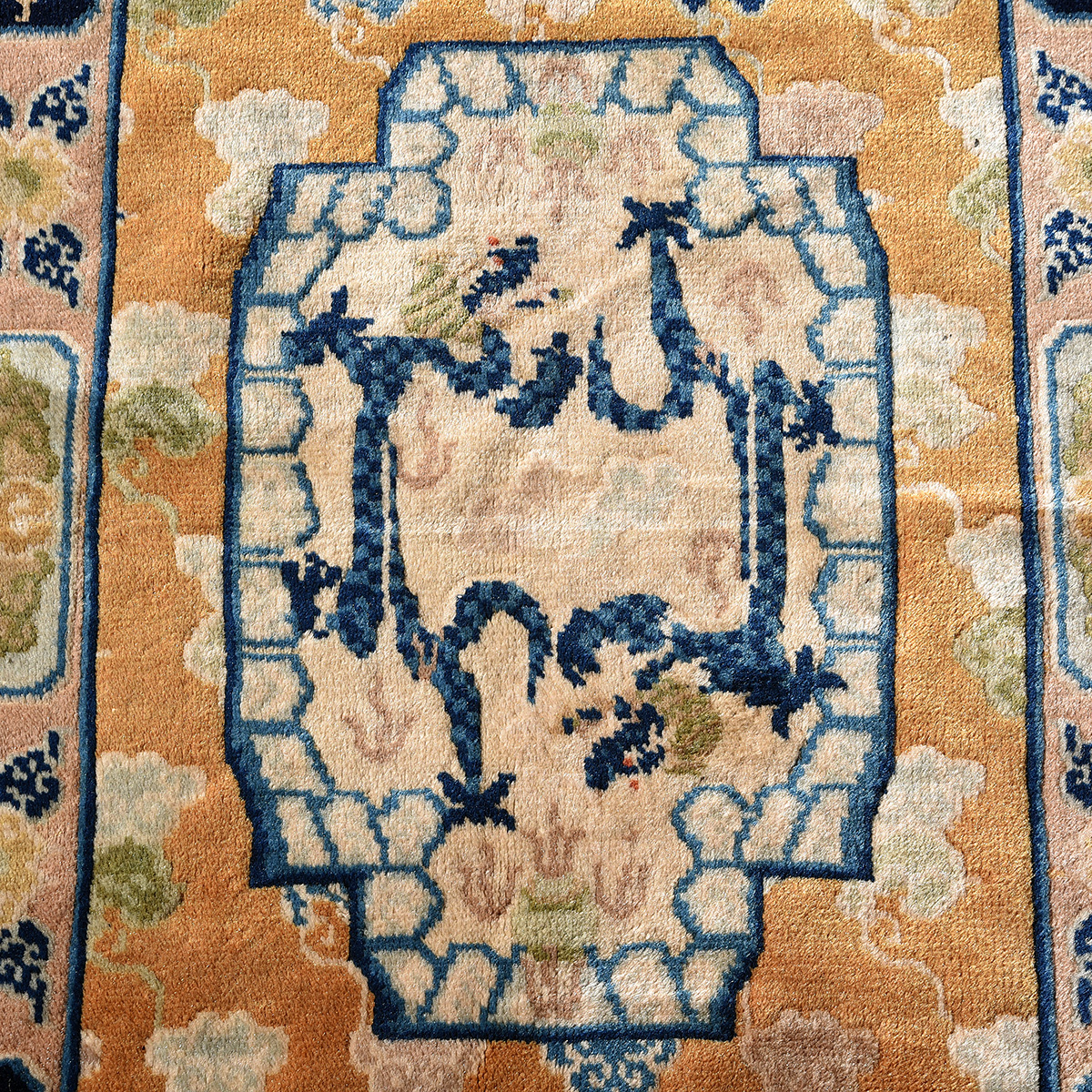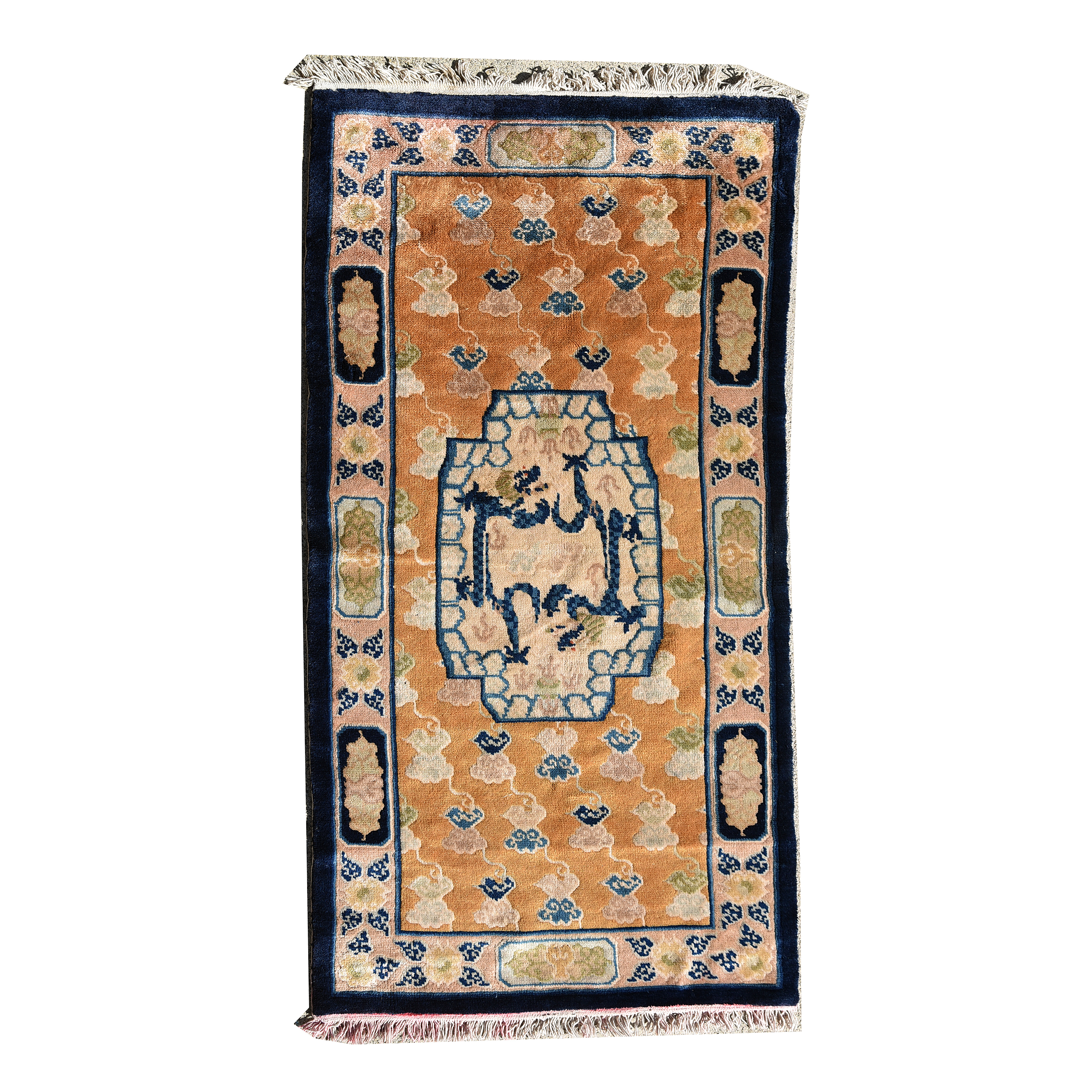 Central medallion with two blue dragons, on a orange ground with a cloud motif, and a pink main border with a dark blue outer border.