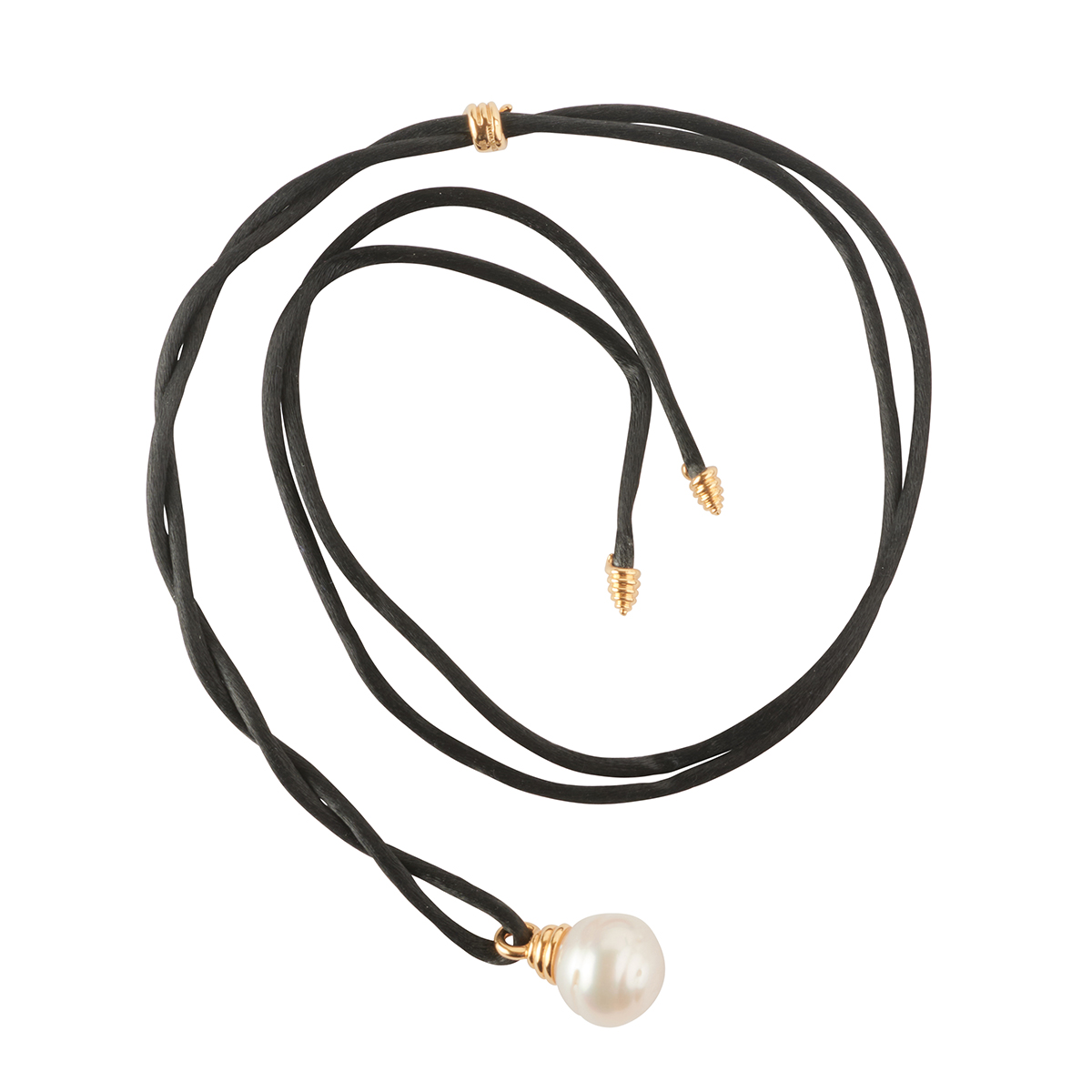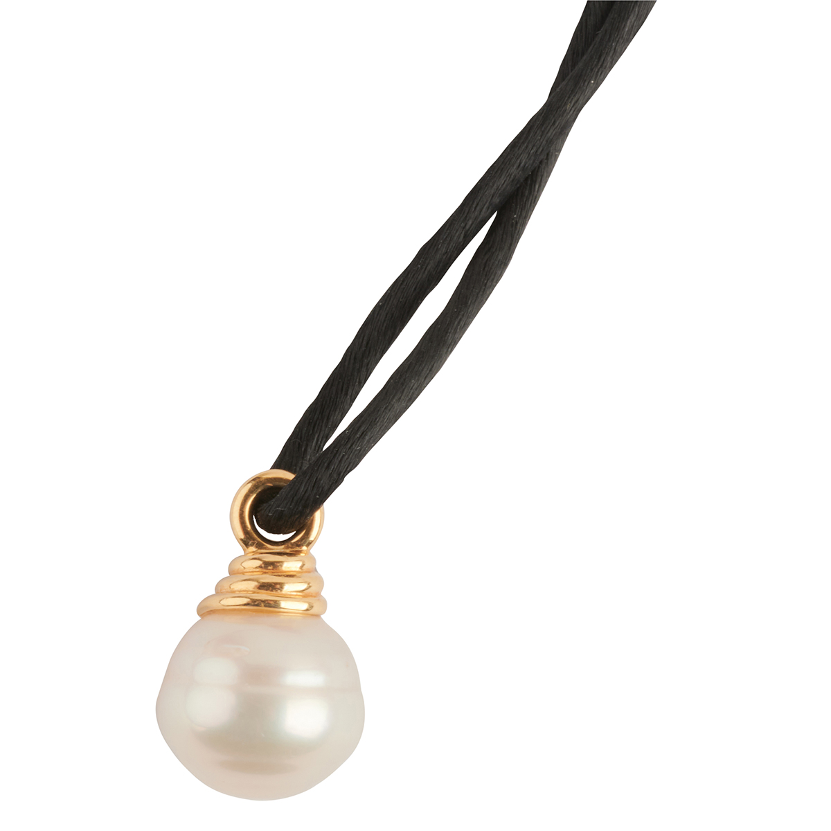 Featuring one south sea cultured pearl measuring approximately 15.6 x 14.5 mm, capped by an 18k yellow gold coiled bail, suspended from a silk cord with one 18k yellow gold coiled spacer and terminated by two 18k yellow gold coiled tips, forming an adjustable necklace. Accompanied by a Tiffany Co. necklace pouch.