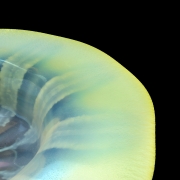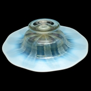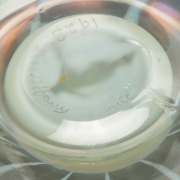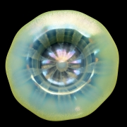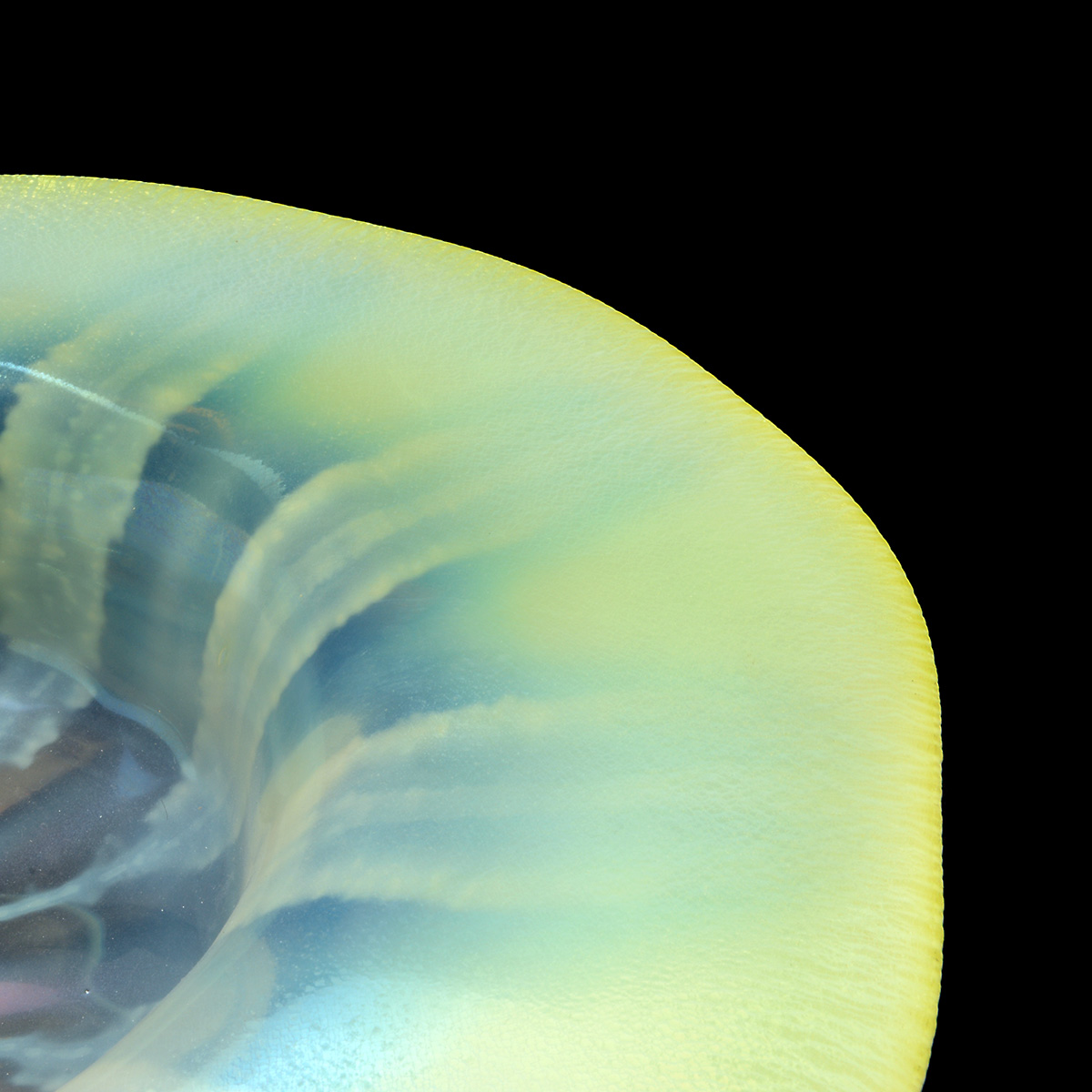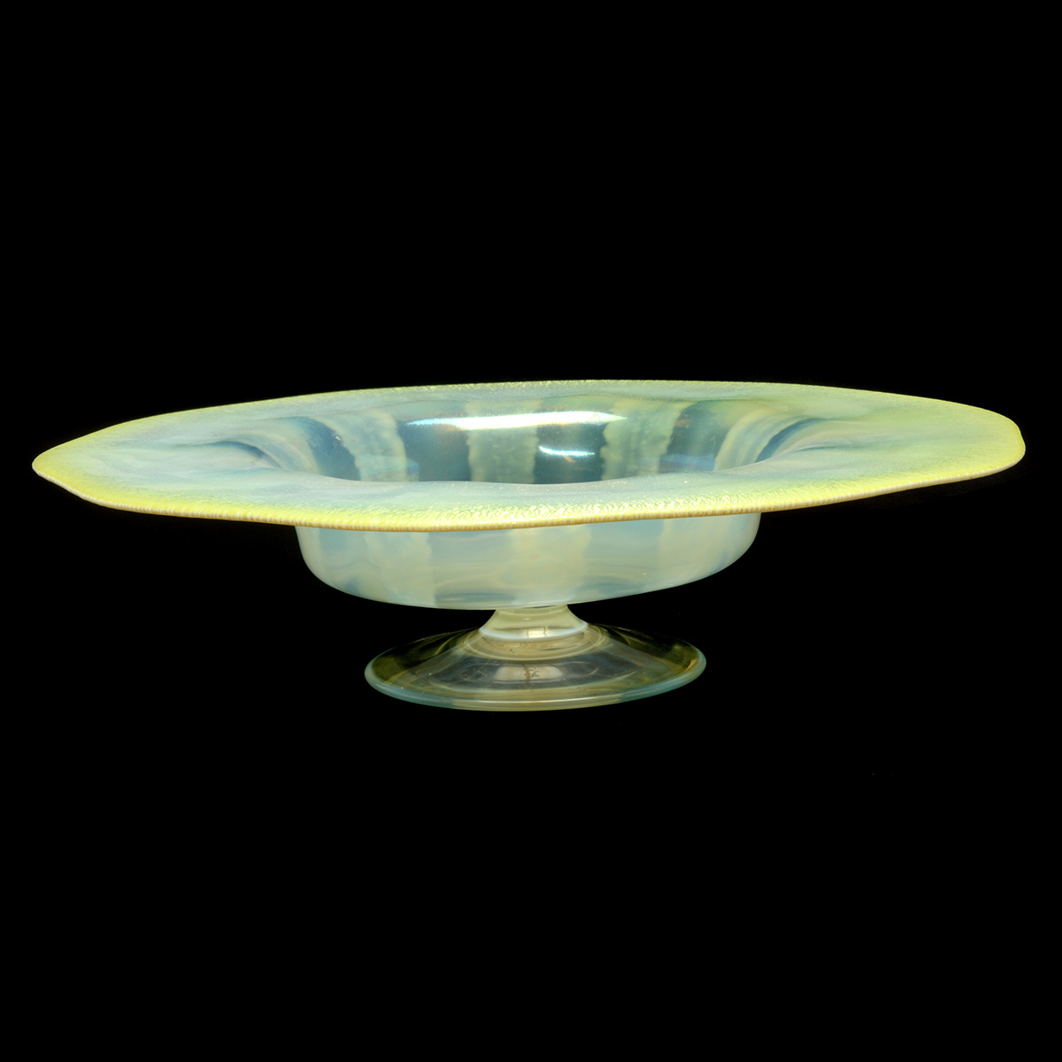 Slightly scalloped edge with a wide and flat rim, set on a round foot. Yellow-green pastel glass rim, with bands of the same color emanating from the center.