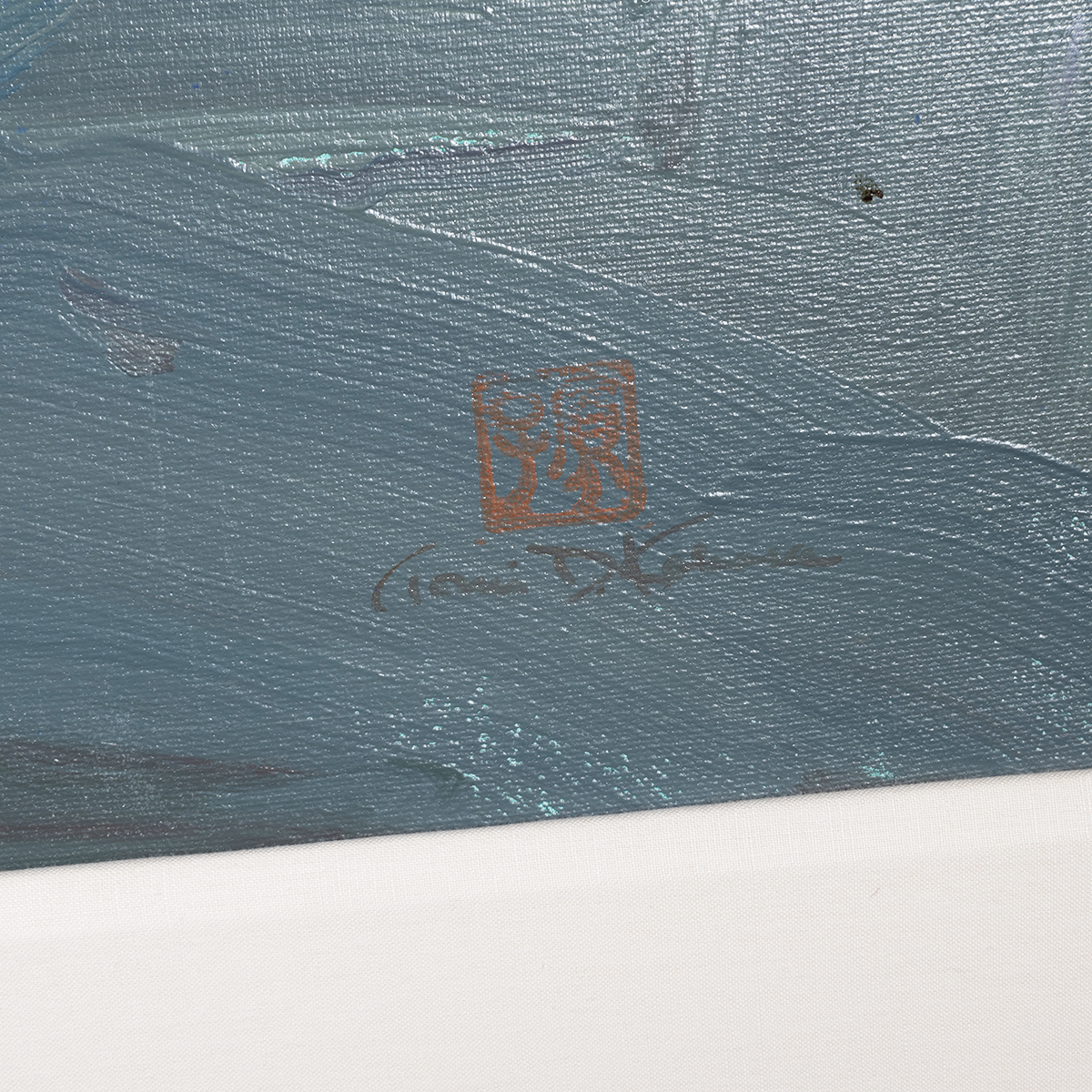 Condition: Surface dust and minor frame abrasion. Dirt pockets, paint bleed, and mildew on canvas verso.