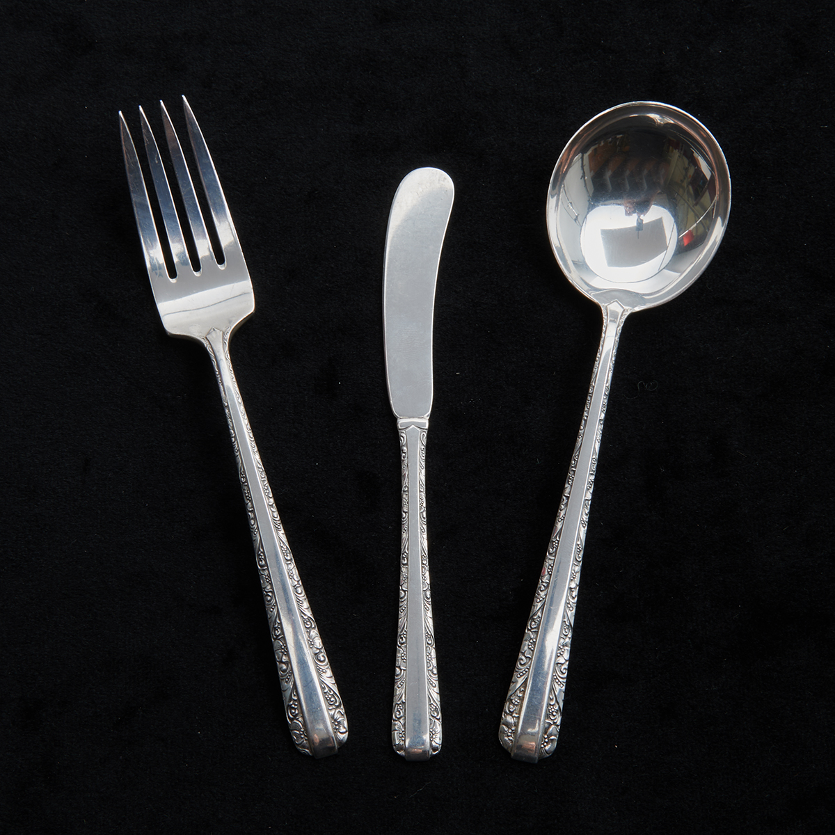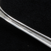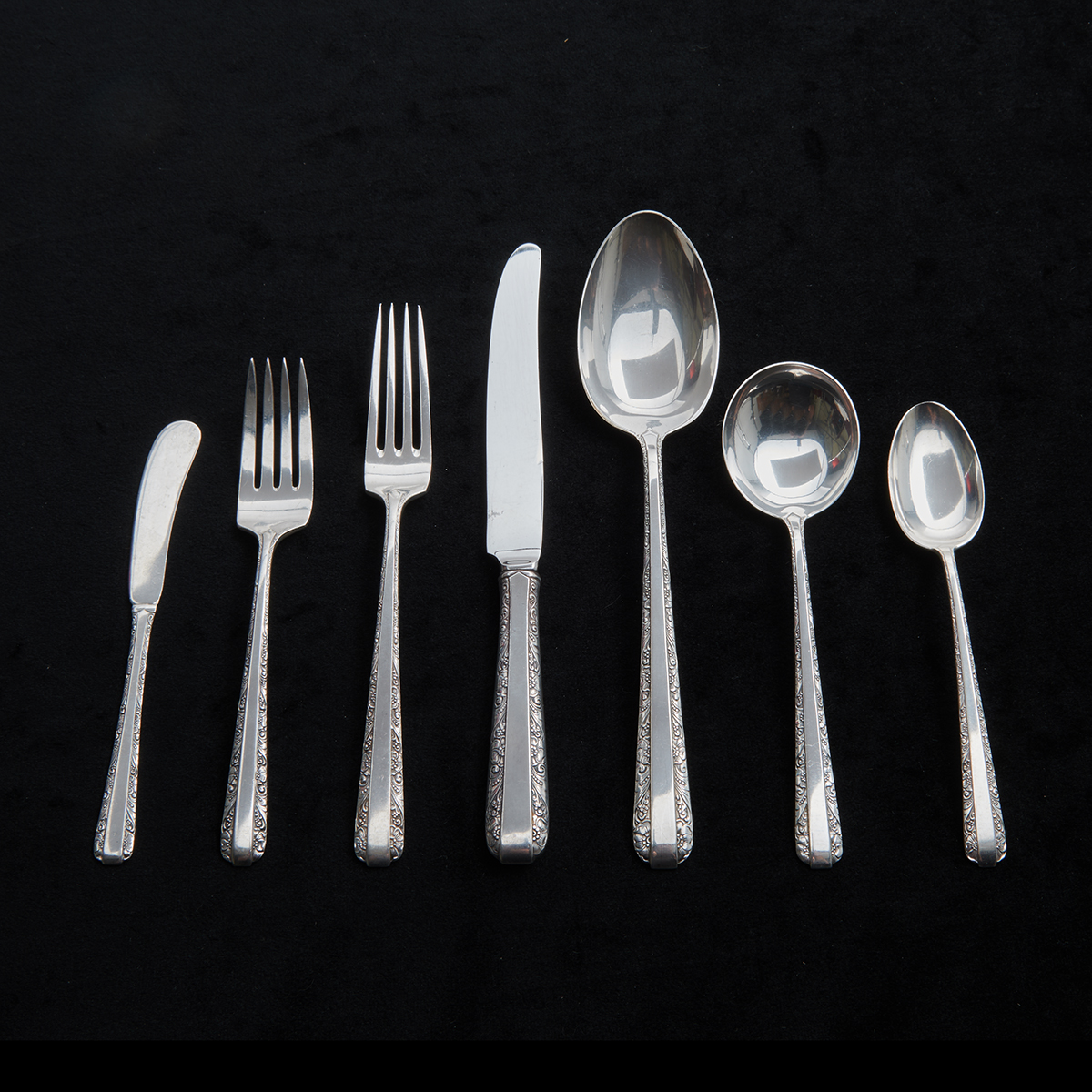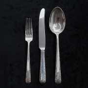 Comprising 2 place knives, 4 butter spreaders, 5 place forks, 8 salad forks, 5 bouillon spoons, 7 teaspoons, 1 tablespoon. (32 pieces total).
