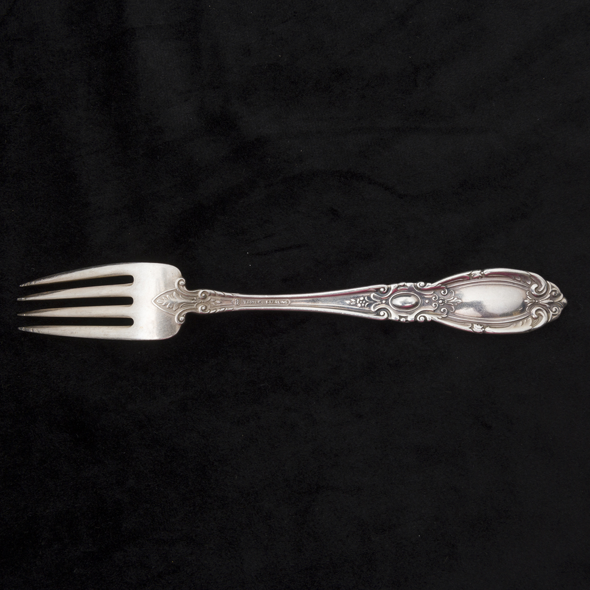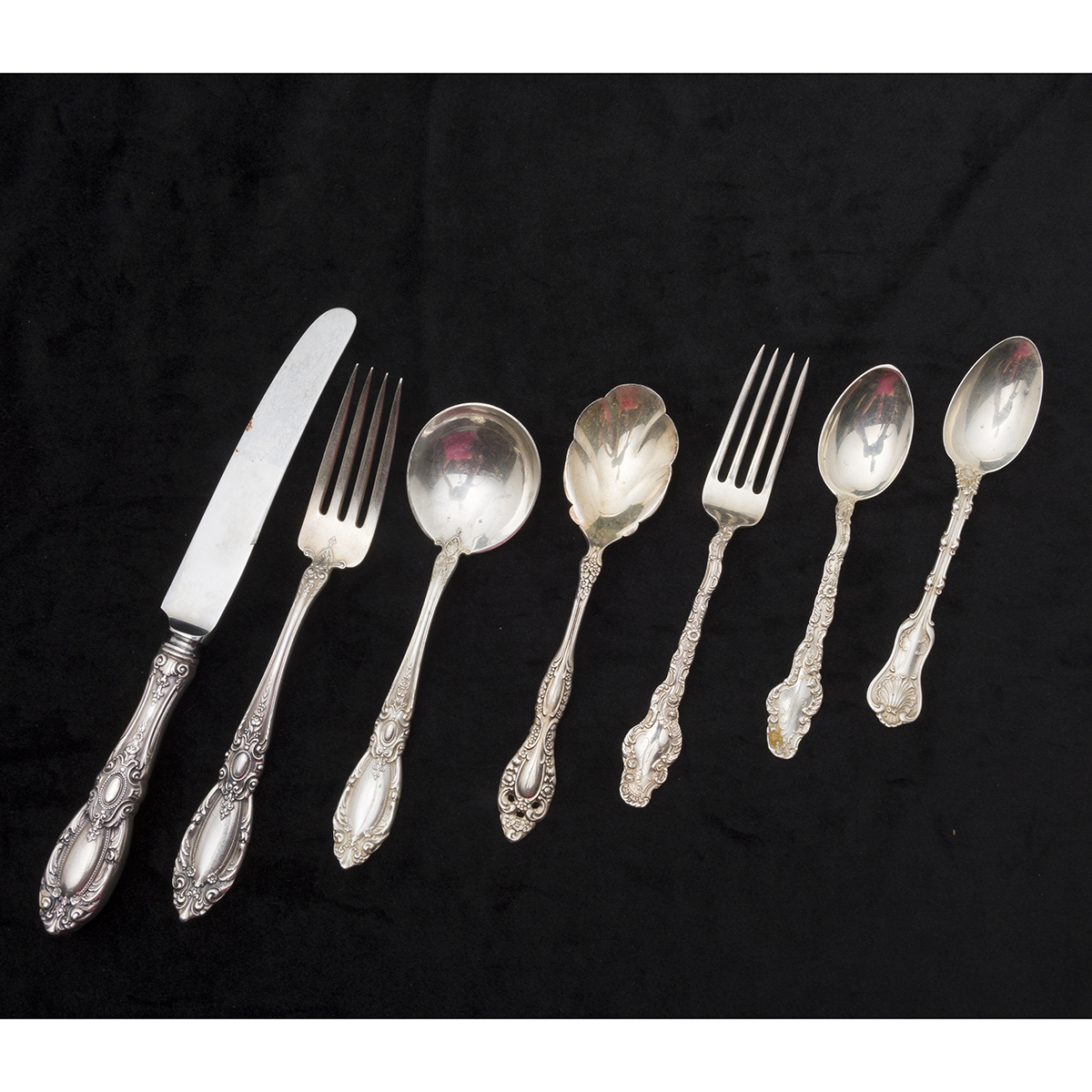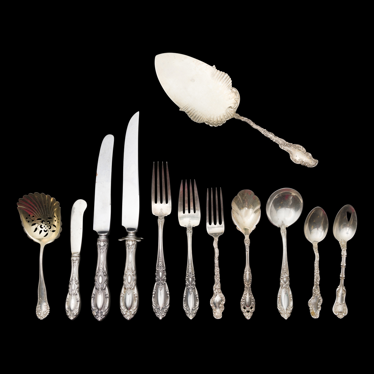 Comprising 6 dinner knives, 1 butter spreader, 8 dinner forks, 8 salad forks, 8 teaspoons, 1 bouillon spoon, 1 baby spoon, 1 demitasse spoon, 1 sugar spoon, 1 pie server, 1 carving knife additional pieces comprising 12 Durgin dessert forks, 11 Durgin teaspoons, 6 Whiting teaspoons, 1 Gorham fish fork, 1 Gorham serving piece, plated serving tongs (69 pieces total).