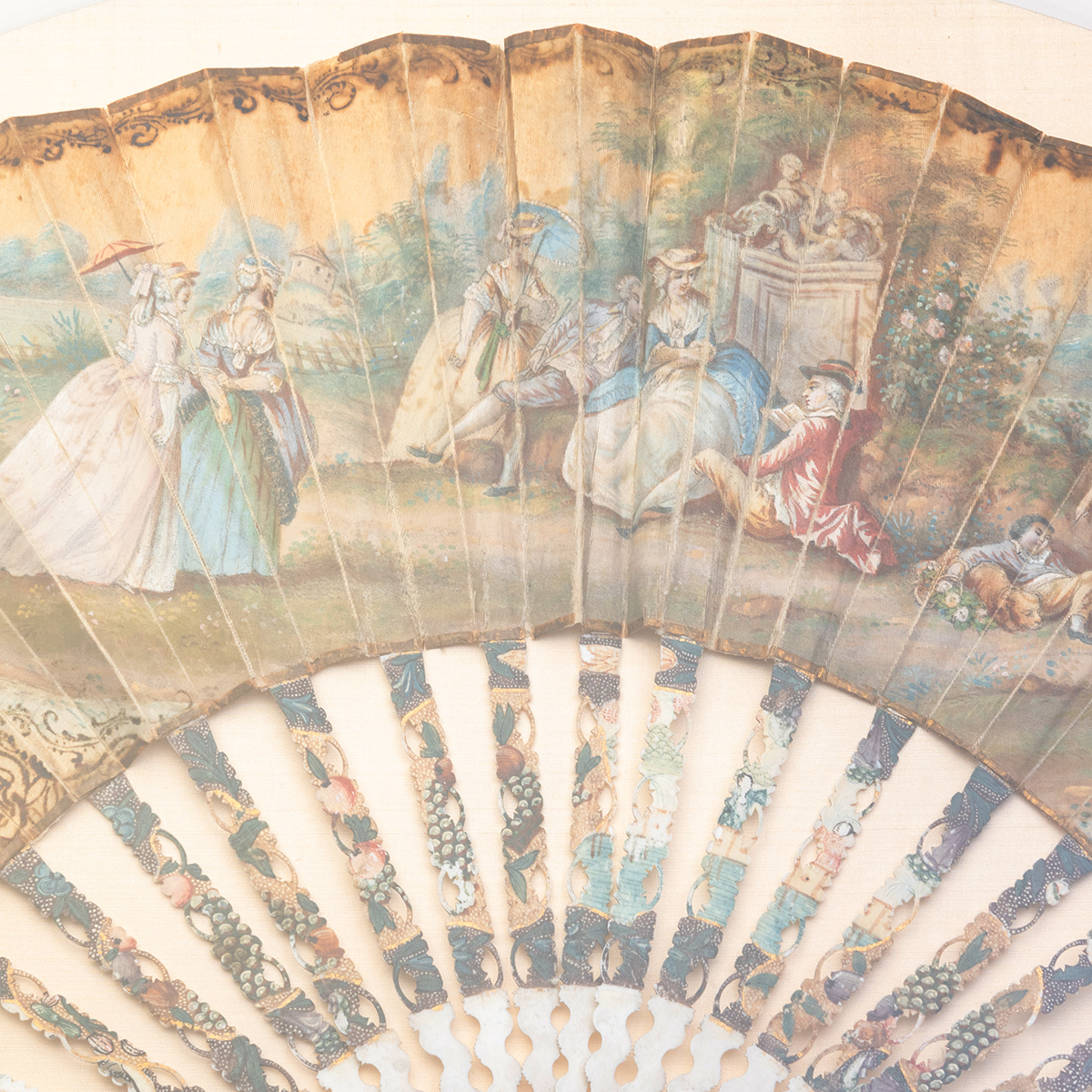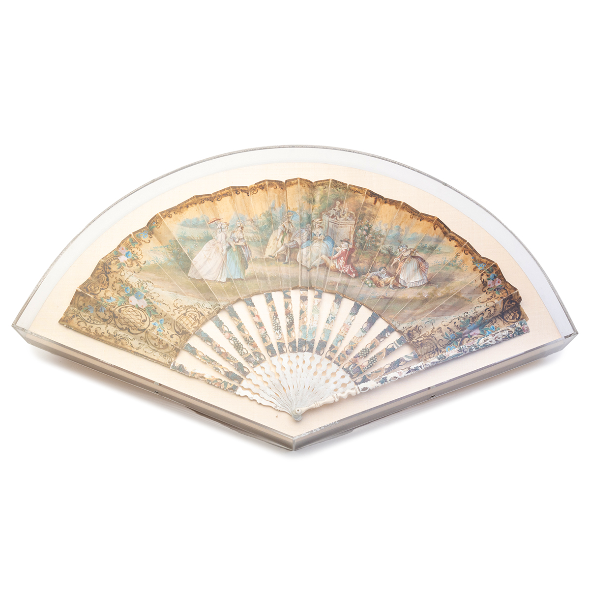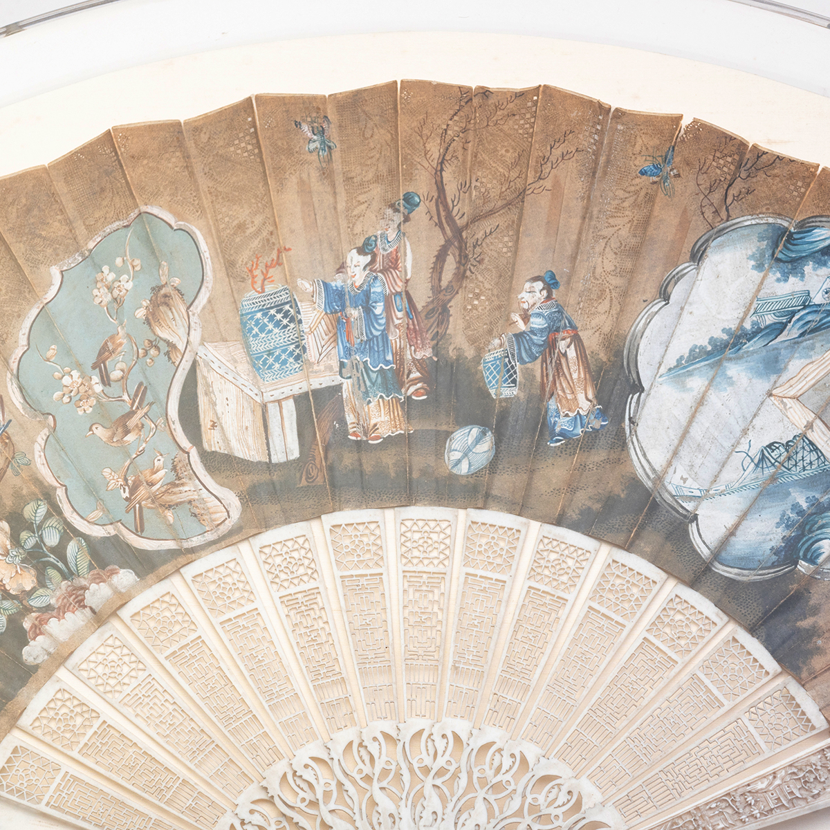 Comprising chinoiserie pierced paper and bone example, and painted silk and bone example decorated with figures in garden both in shadowbox frames.