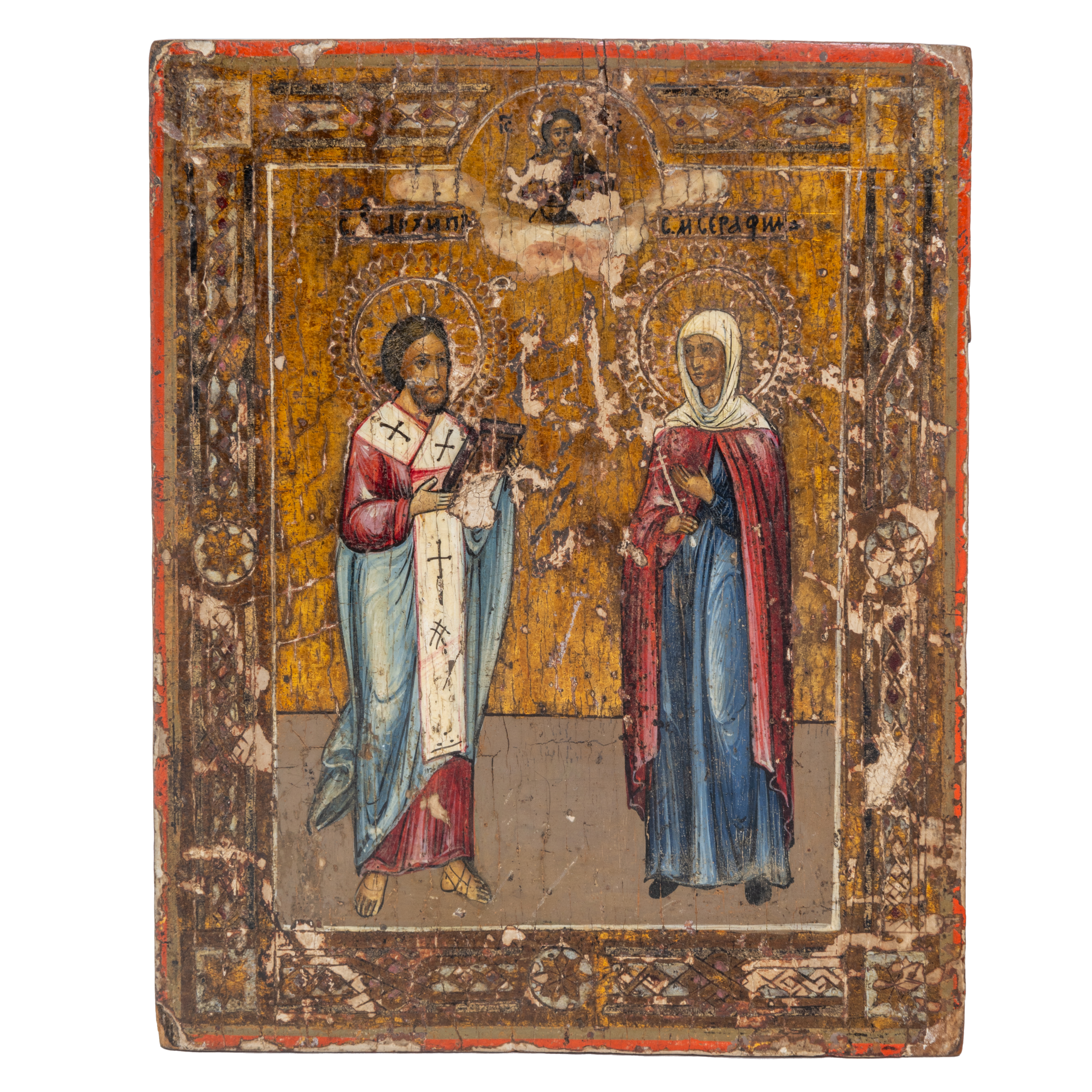 Both painted on wood comprising icon with Saint George on horseback with small figure behind slaying the dragon, set in red landscape with gilt sky and icon with the Virgin Mother standing next to a Saint holding a book wearing a stole, with Christ above, all on gilt ground.