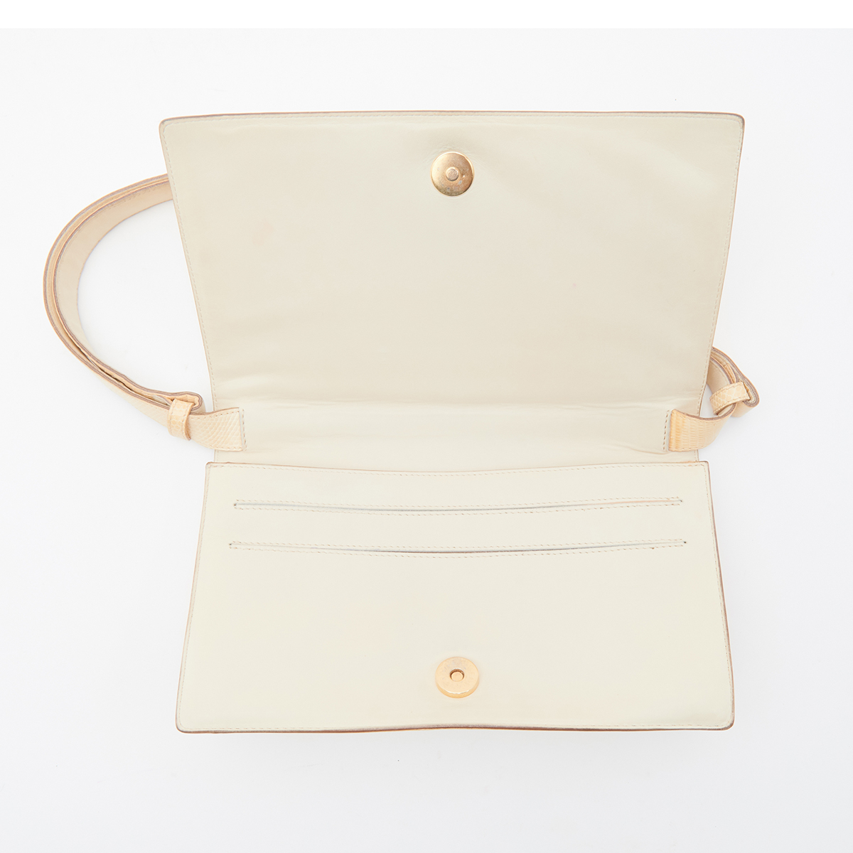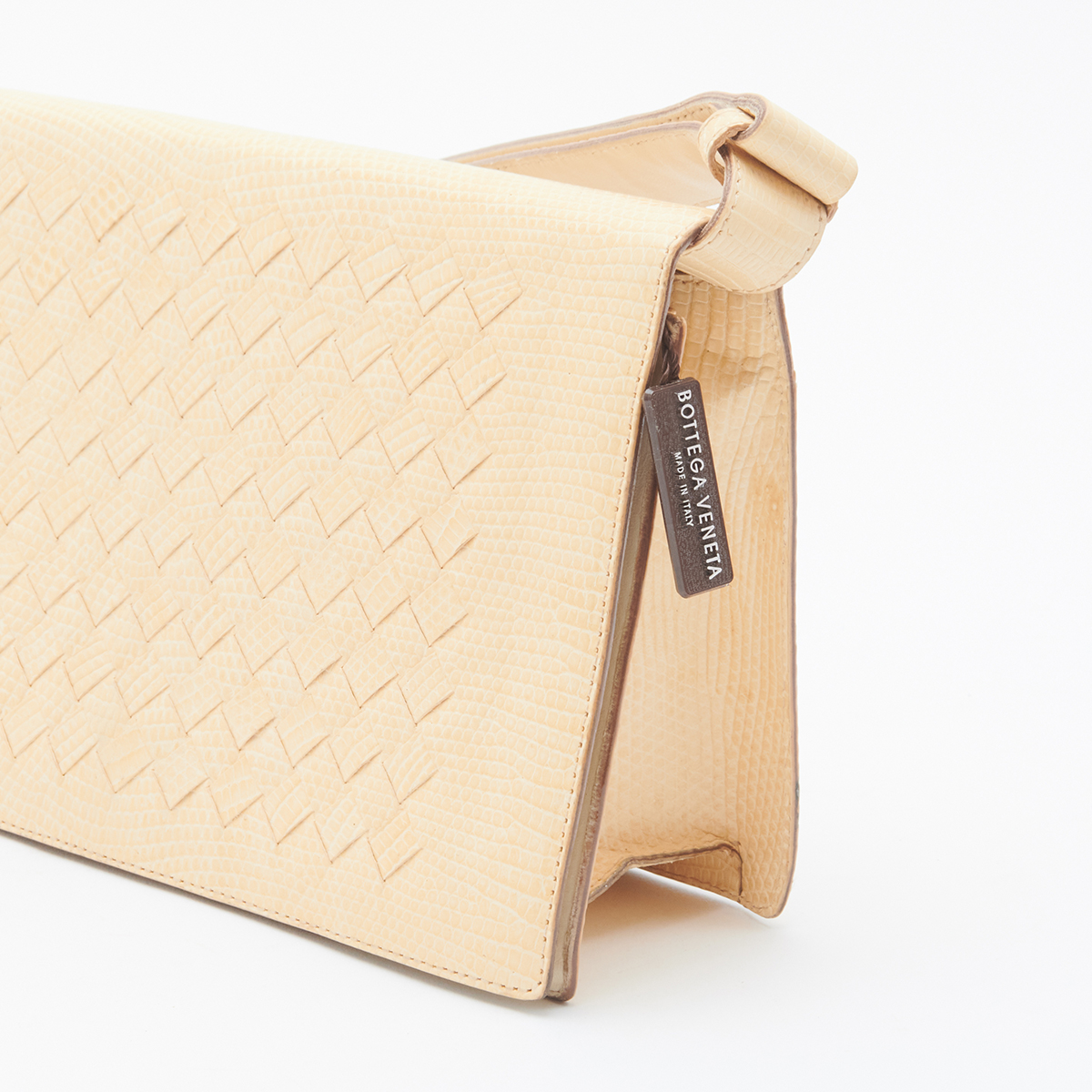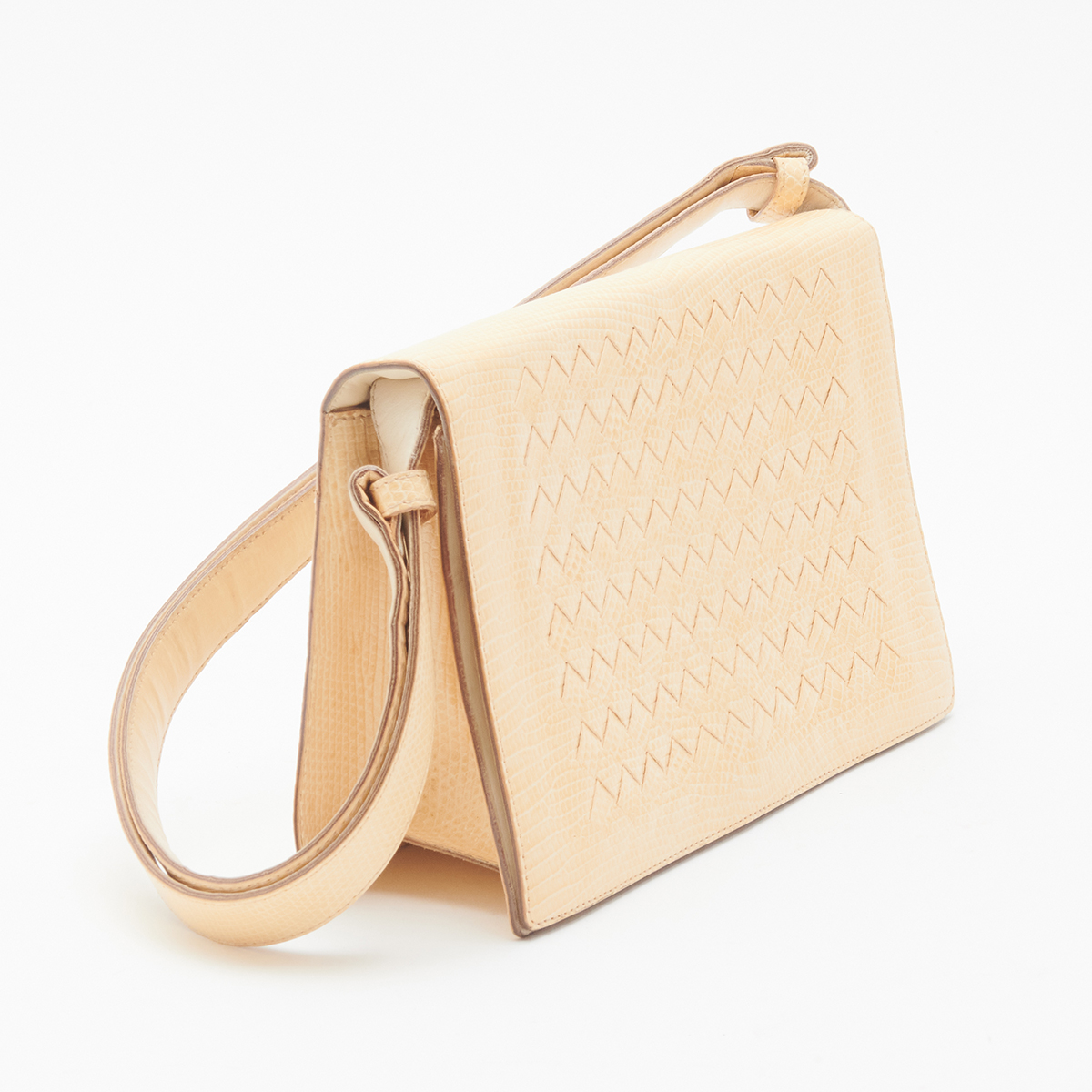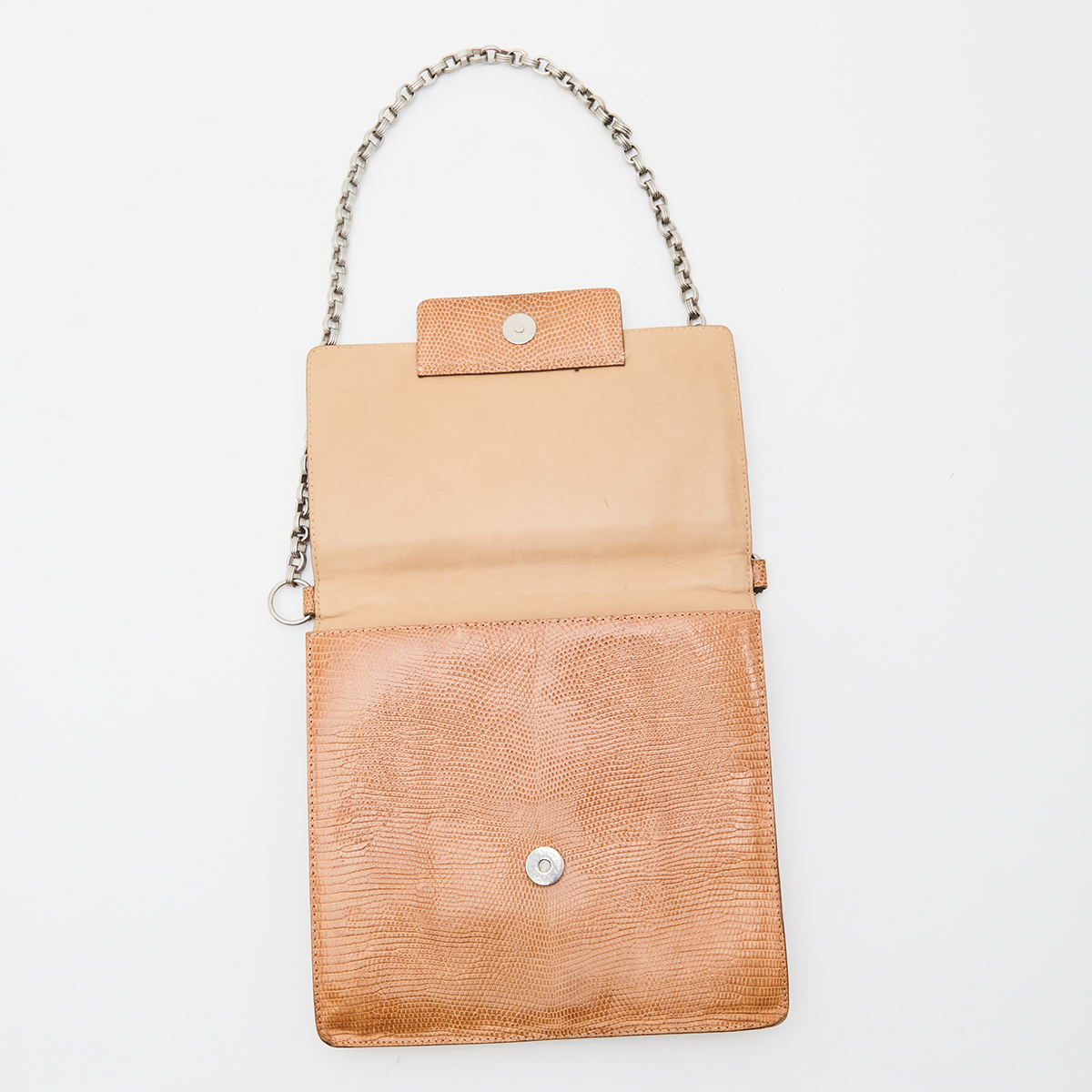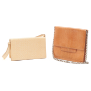 Comprising caramel brown reptile style leather shoulder bag with silver metal chain and cream reptile style leather bag with woven cover, also with branded mirror and authenticity card both with branded dust bag covers.