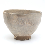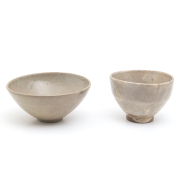 Comprising: a Japanese cream-glazed Hagi-type pottery bowl of irregular rounded form and a Chinese Song-style light bluish-brown glazed bowl, both with wooden boxes.