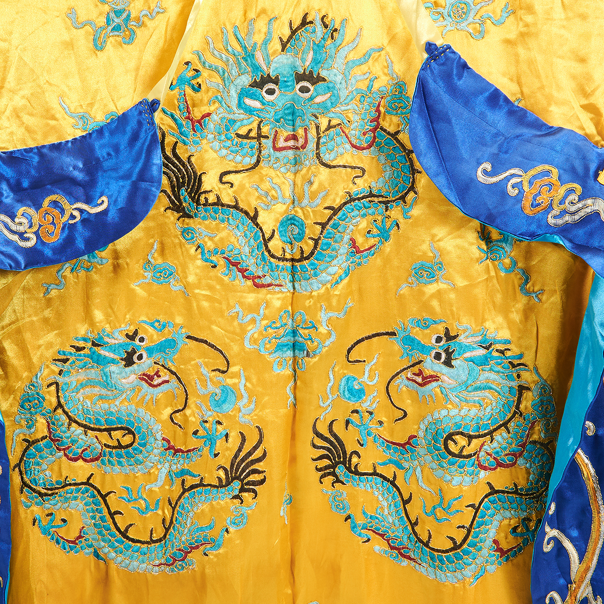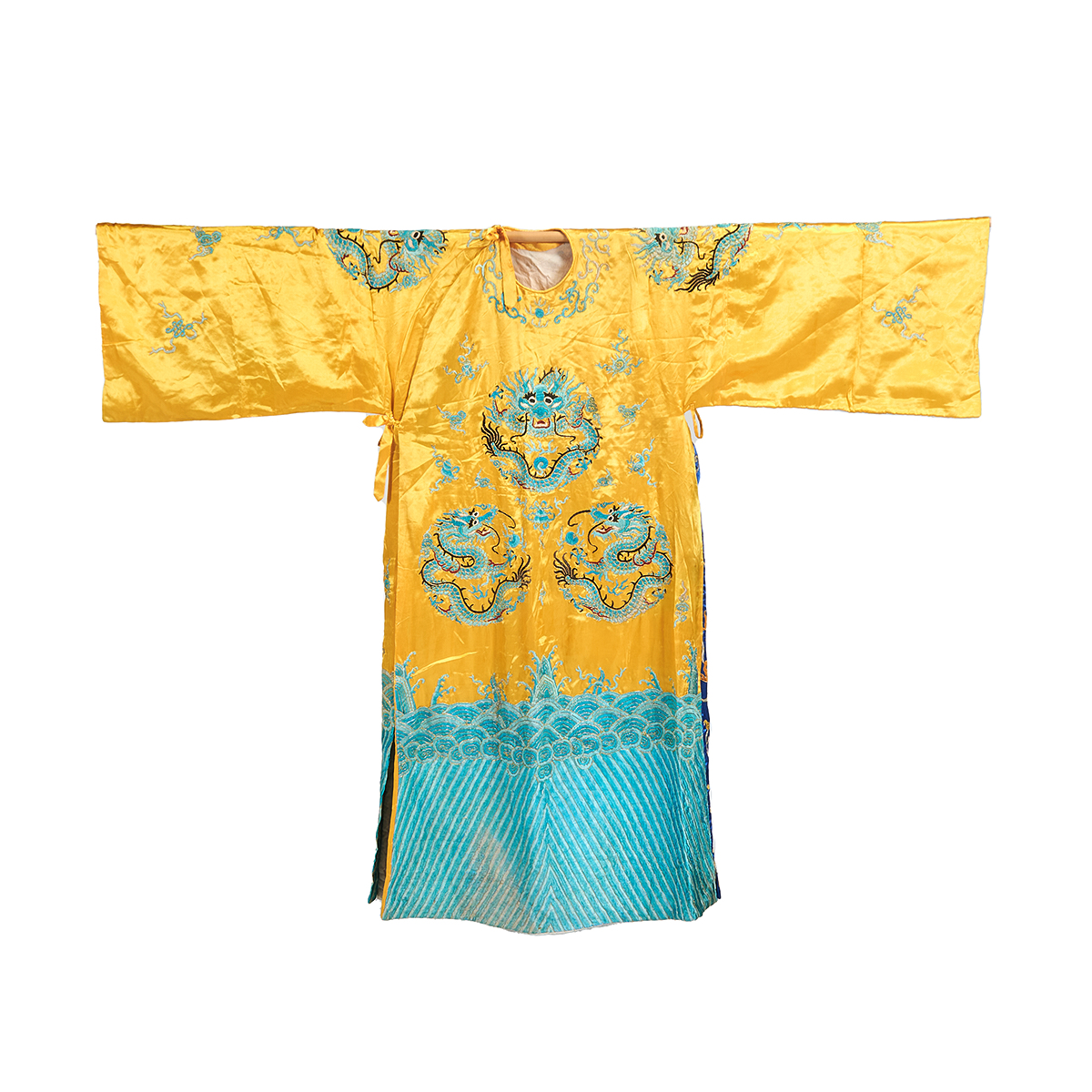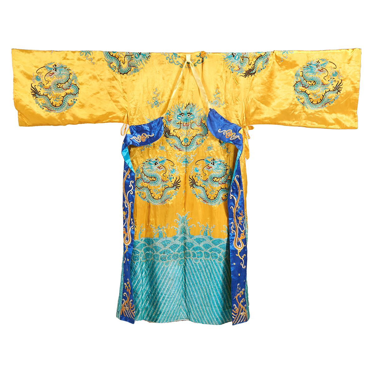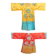 Comprising: the first is a yellow ground dragon robe, embroidered on the front and back in satin stitch and couched mainly with blue threads. It features nine dragon roundels above crashing waves and jagged rocks, with a lishui stripe at the hem. The second is a red ground silk embroidered robe, embroidered on the front and back in satin stitch with crane and peony roundels. The sleeves and bottom hem are decorated with crashing ocean waves in gilt-colored threads.