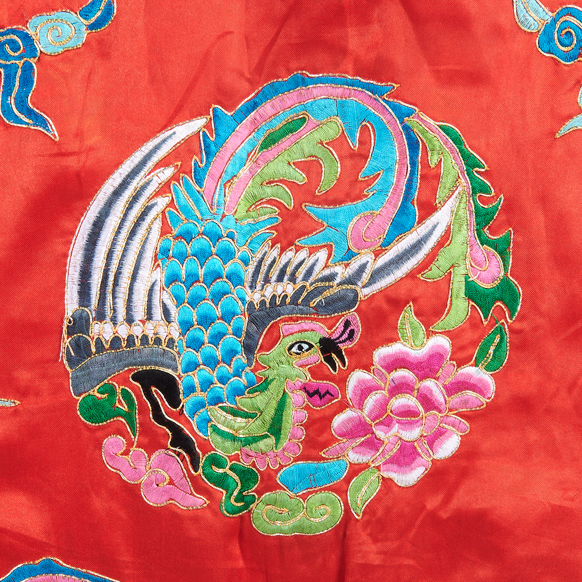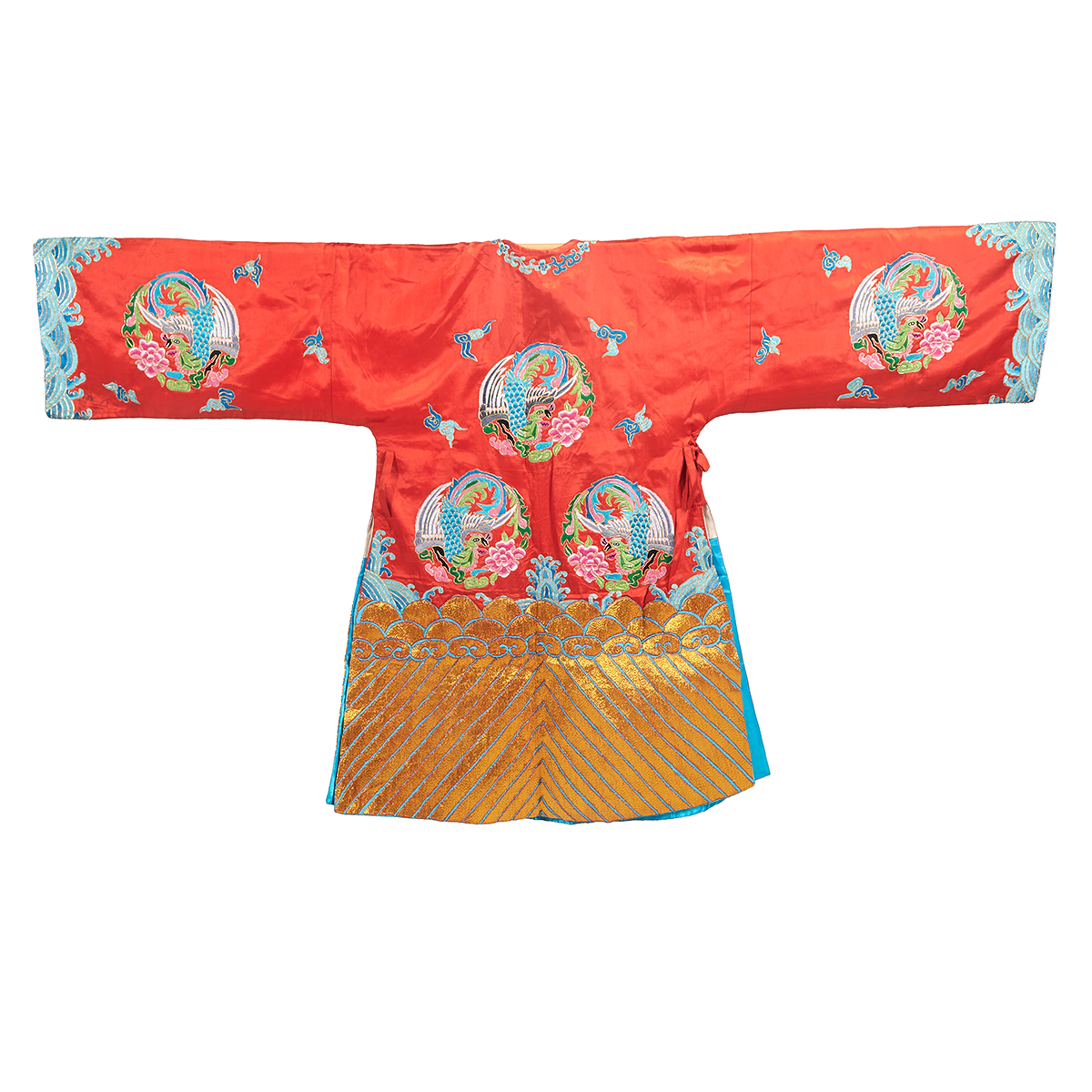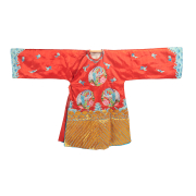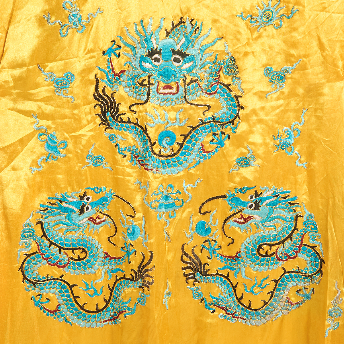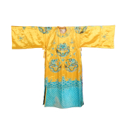 Comprising: the first is a yellow ground dragon robe, embroidered on the front and back in satin stitch and couched mainly with blue threads. It features nine dragon roundels above crashing waves and jagged rocks, with a lishui stripe at the hem. The second is a red ground silk embroidered robe, embroidered on the front and back in satin stitch with crane and peony roundels. The sleeves and bottom hem are decorated with crashing ocean waves in gilt-colored threads.