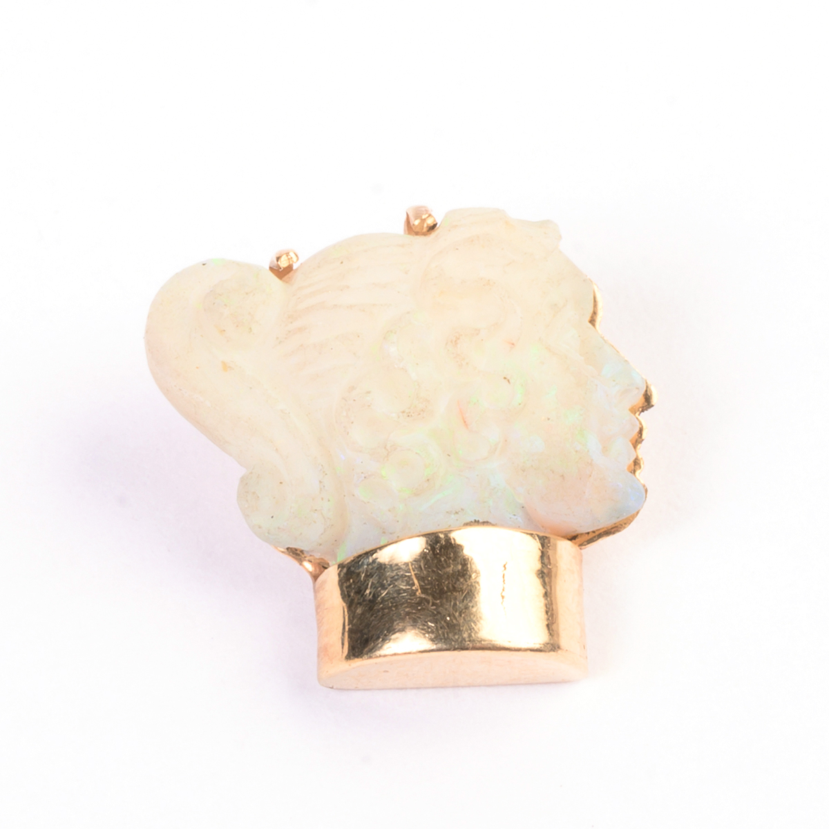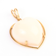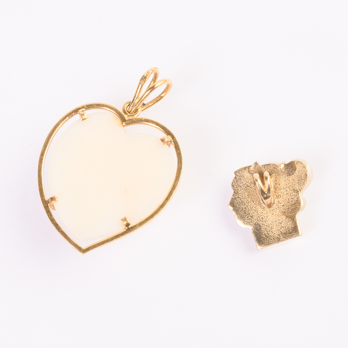 Including one heart shaped coral cabochon, 18k yellow gold pendant measuring approximately 31 x 26 mm together with one carved opal cameo head, 14k yellow gold pendant measuring approximately 16 x 17 mm.
