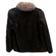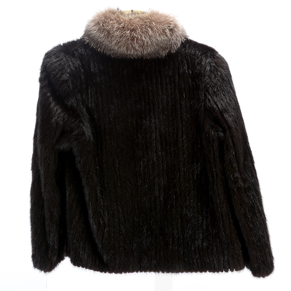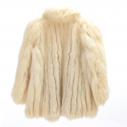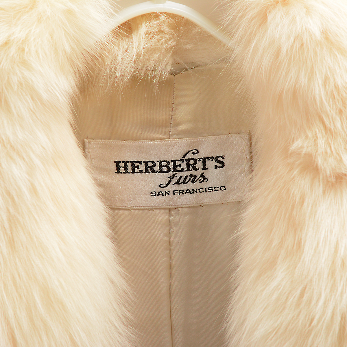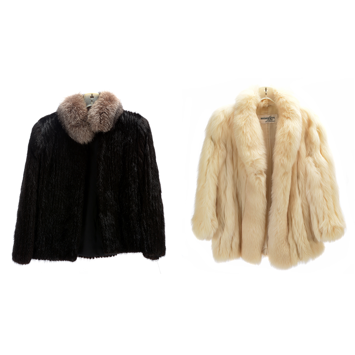 White fox coat with a pink monogram to the lining. Dark brown mink coat with a fox fur collar.