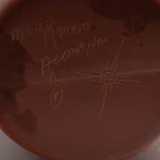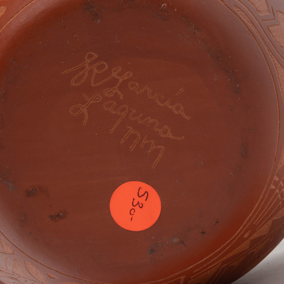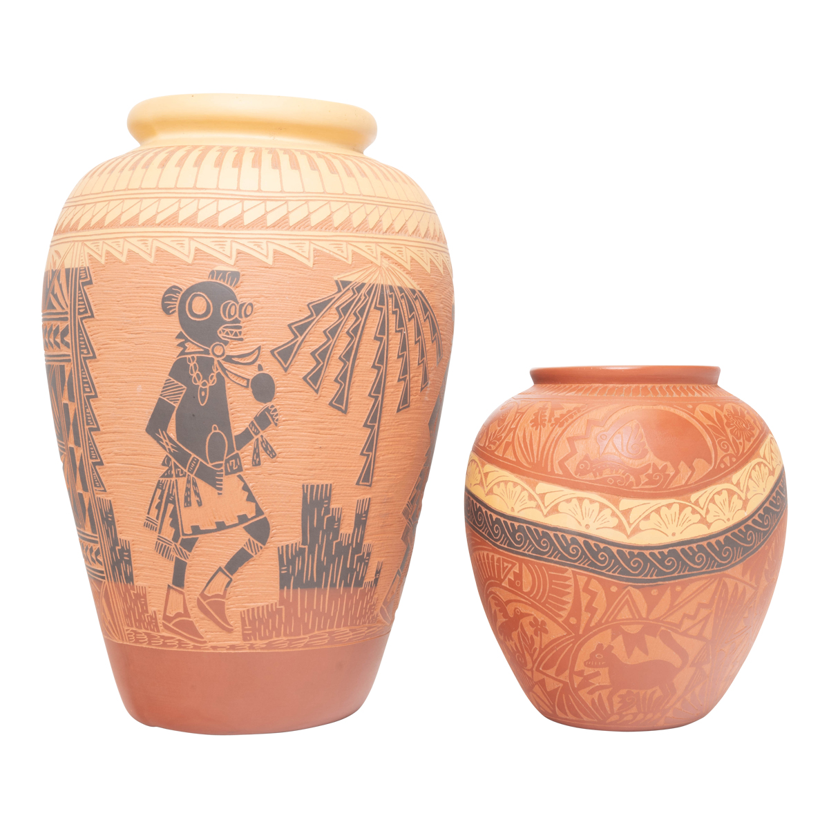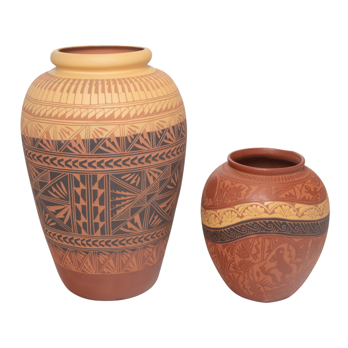 Romero vase with rolled rim, high shoulder, slight taper towards the round foot, with beige to black to red glaze, incised figural and geometric decoration throughout the Garcia vase with slightly everted rim, high shoulder with gradual taper towards the round foot, red glaze with beige and black bands, incised animal, geometric, and floral decoration.