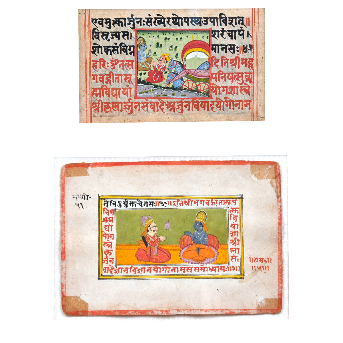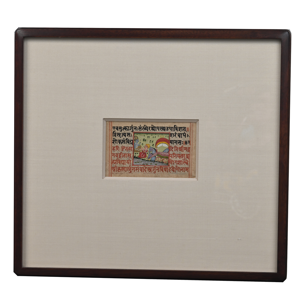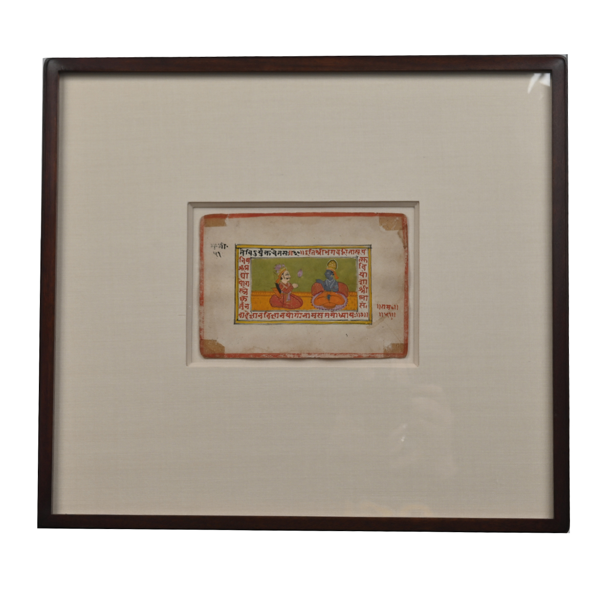 Paintings on paper one scene depicts a man carrying a bow offering a flower to Vishnu, both figures seated the other scene depicts a man with a two horse carriage sitting with Vishnu in a field both scenes framed by Devanagari both with matching wood frames.