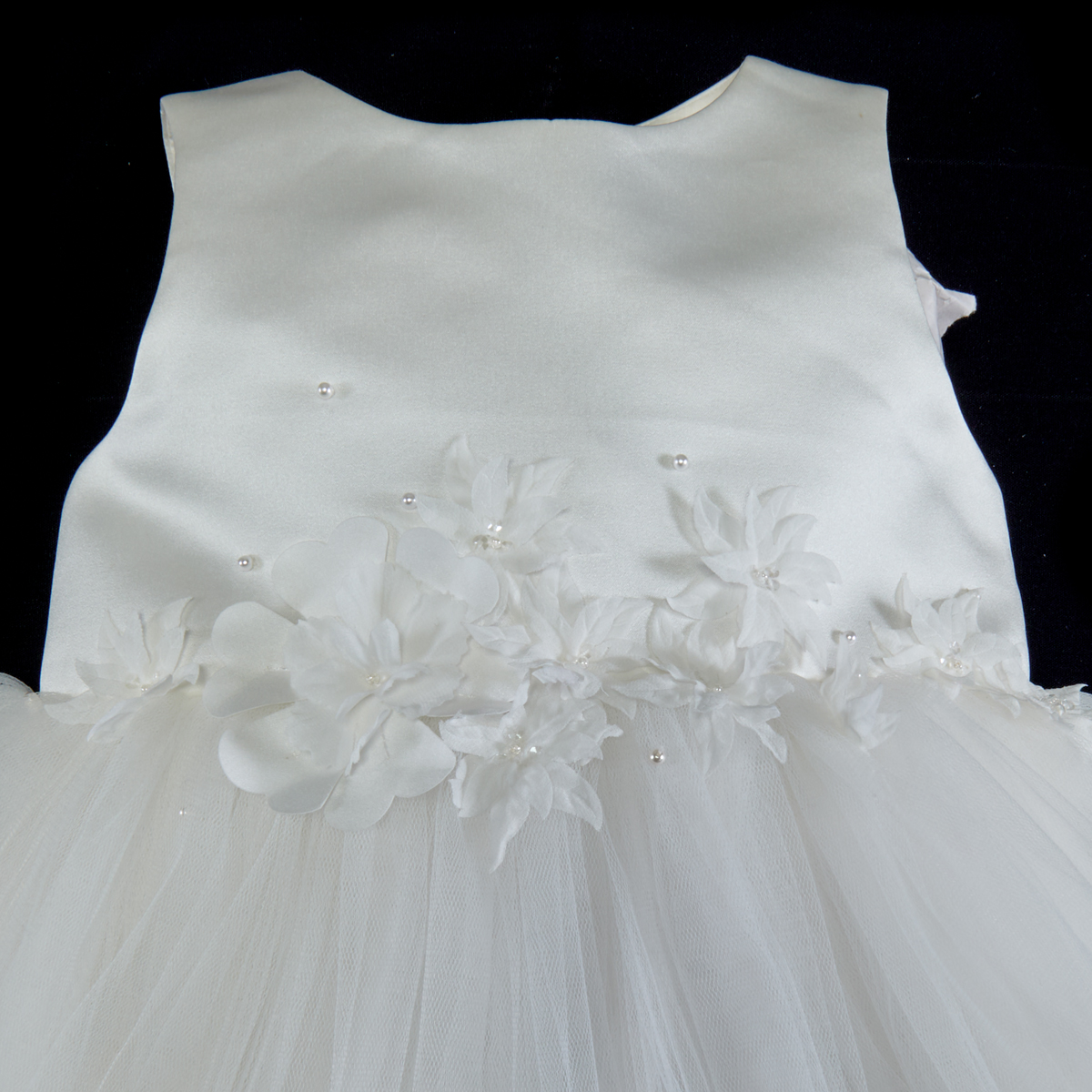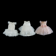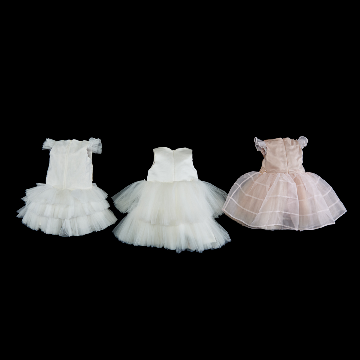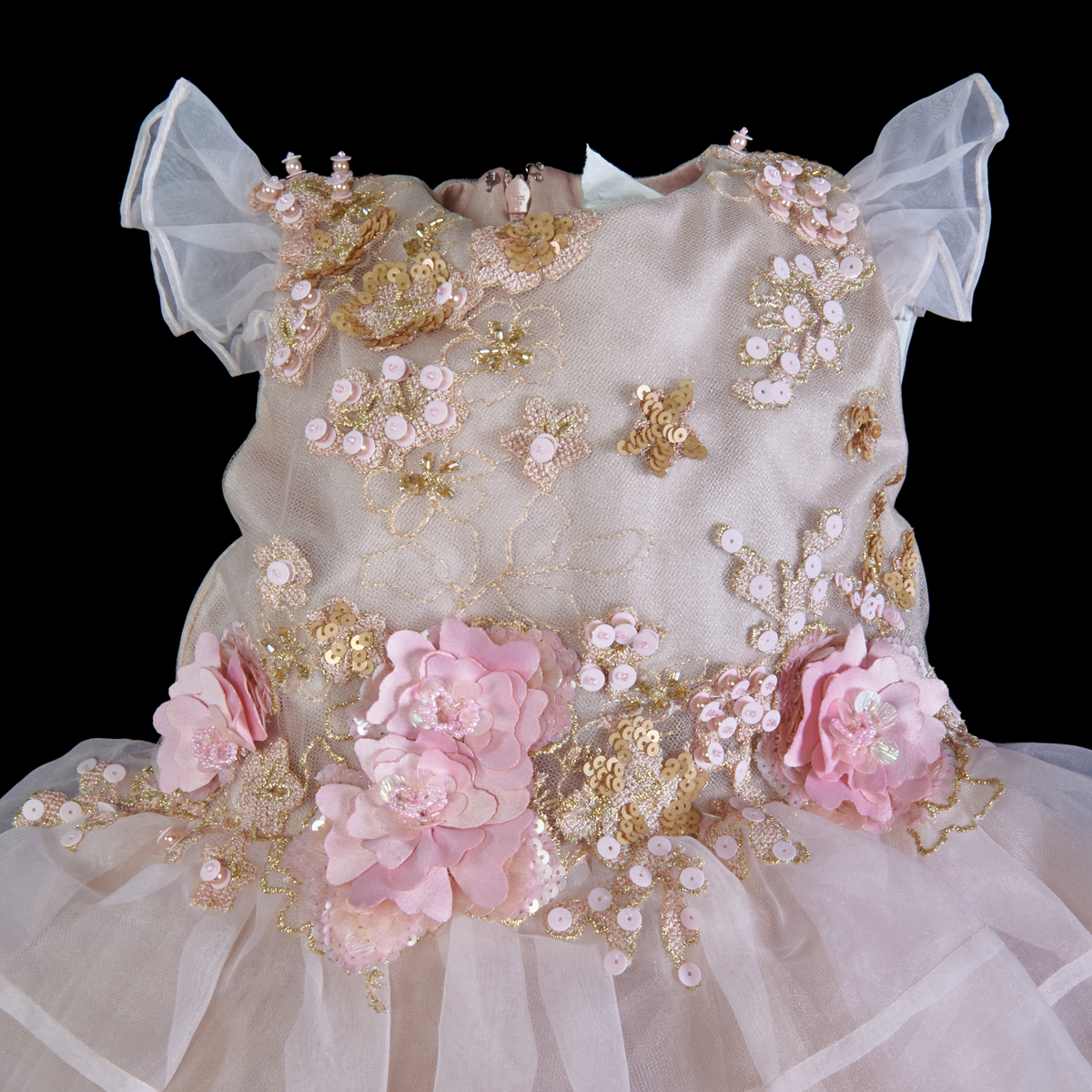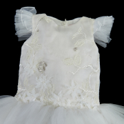 Mischka Aoki sleeveless pink tulle satin lined dress toddler size 4, the bodice elaborately appliqued with sequins, pearls, laser cut flowers, etc. The organza skirt with hemmed bands, and tulle crinoline. Two white Little Miss Aoki lined dresses, with embroidered, beaded, laser cut flower appliques, etc., with tulle flounces.