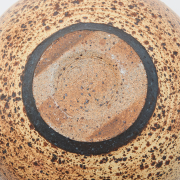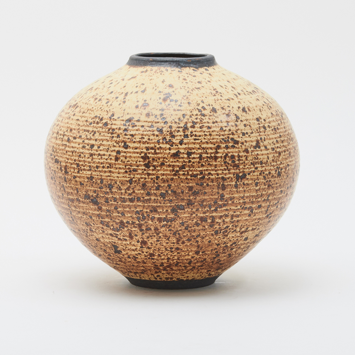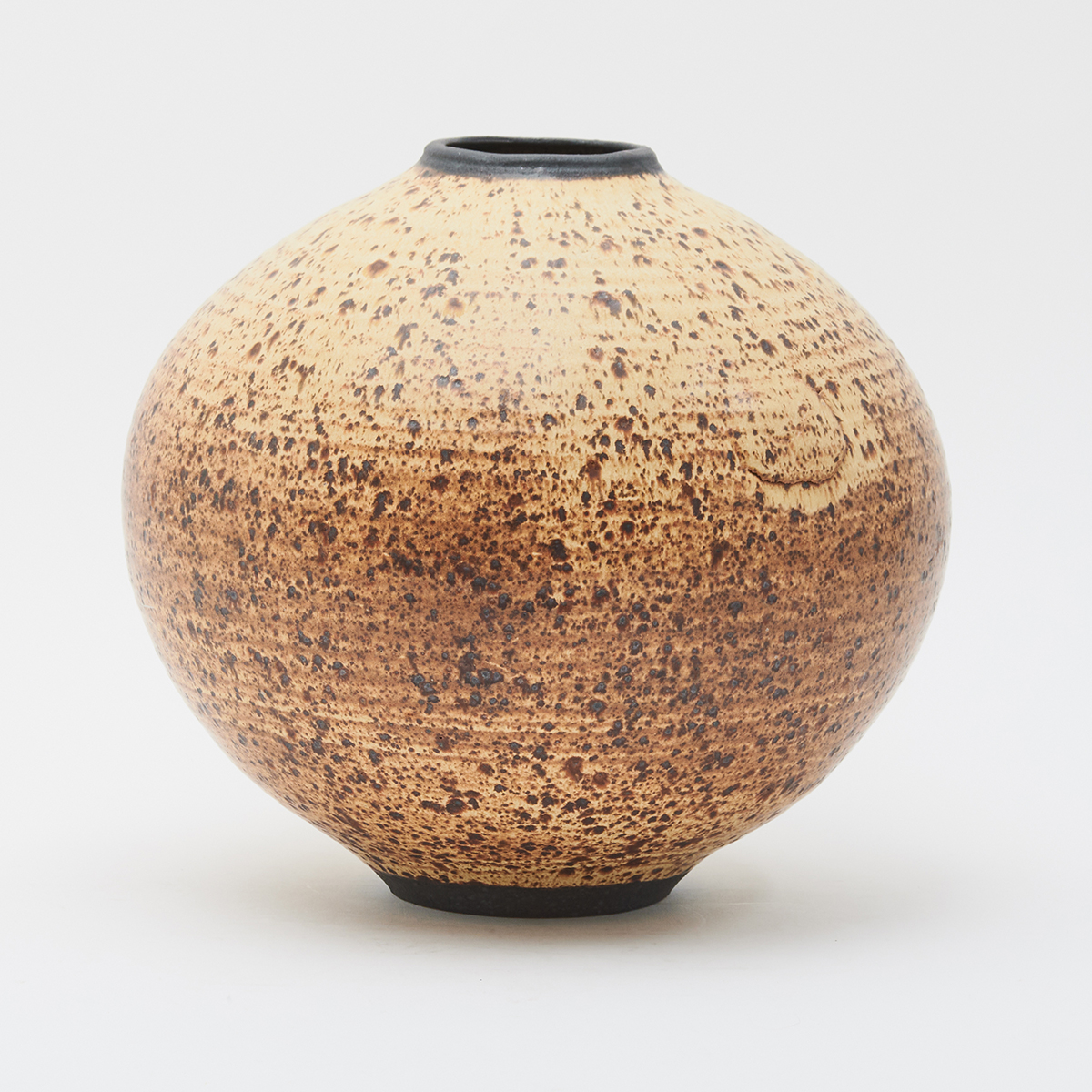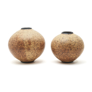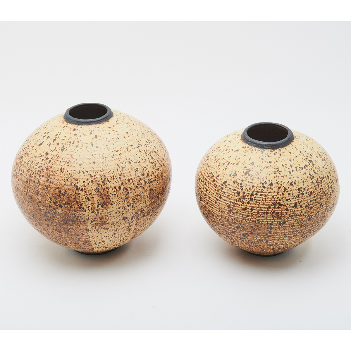Two glazed stoneware globular forms, cream glaze with brown speckle.