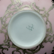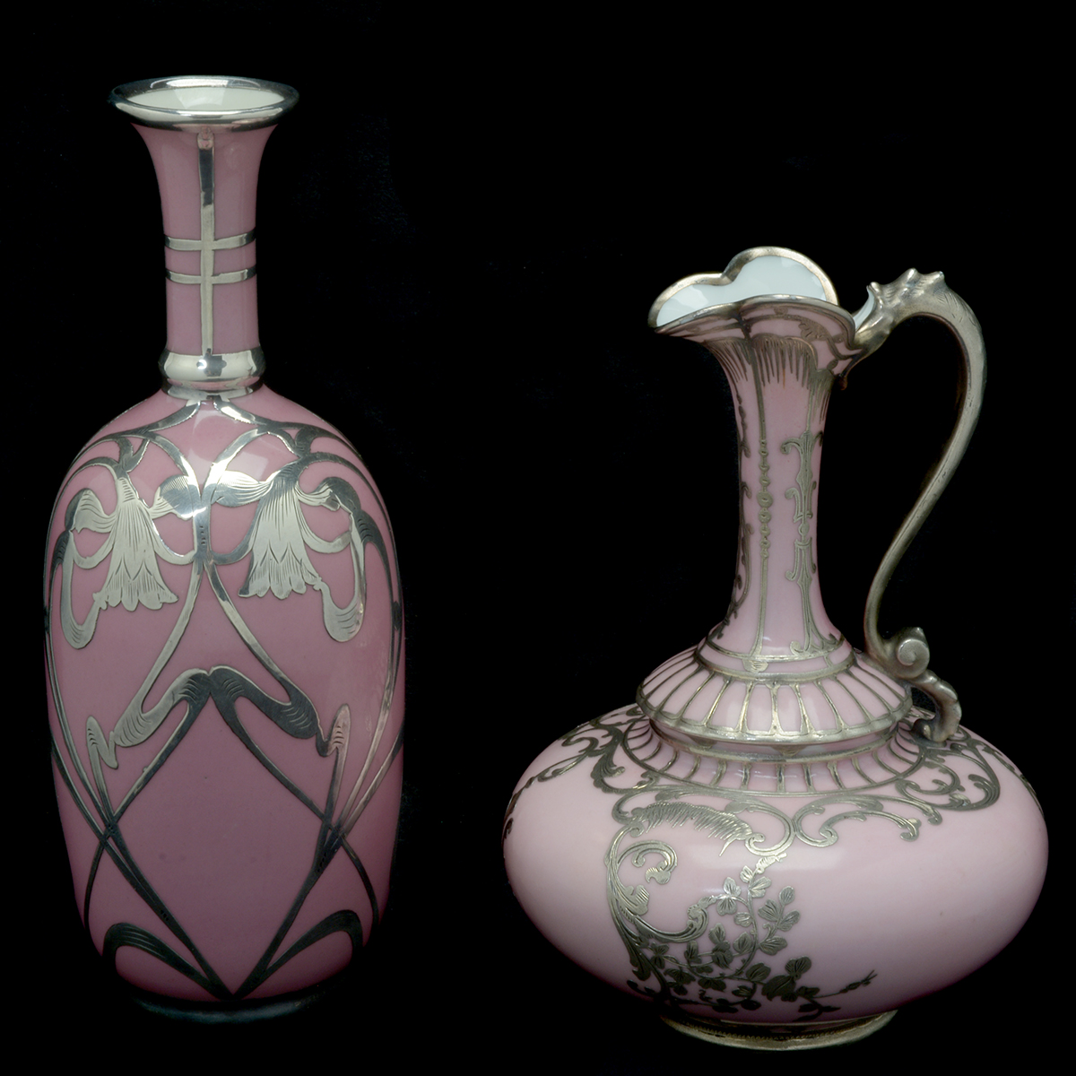 Comprising a Sevres style pitcher with a narrow neck, wide round body, and a foliate motif overlay and an Eamco vase with a narrow neck and a floral overlay design.